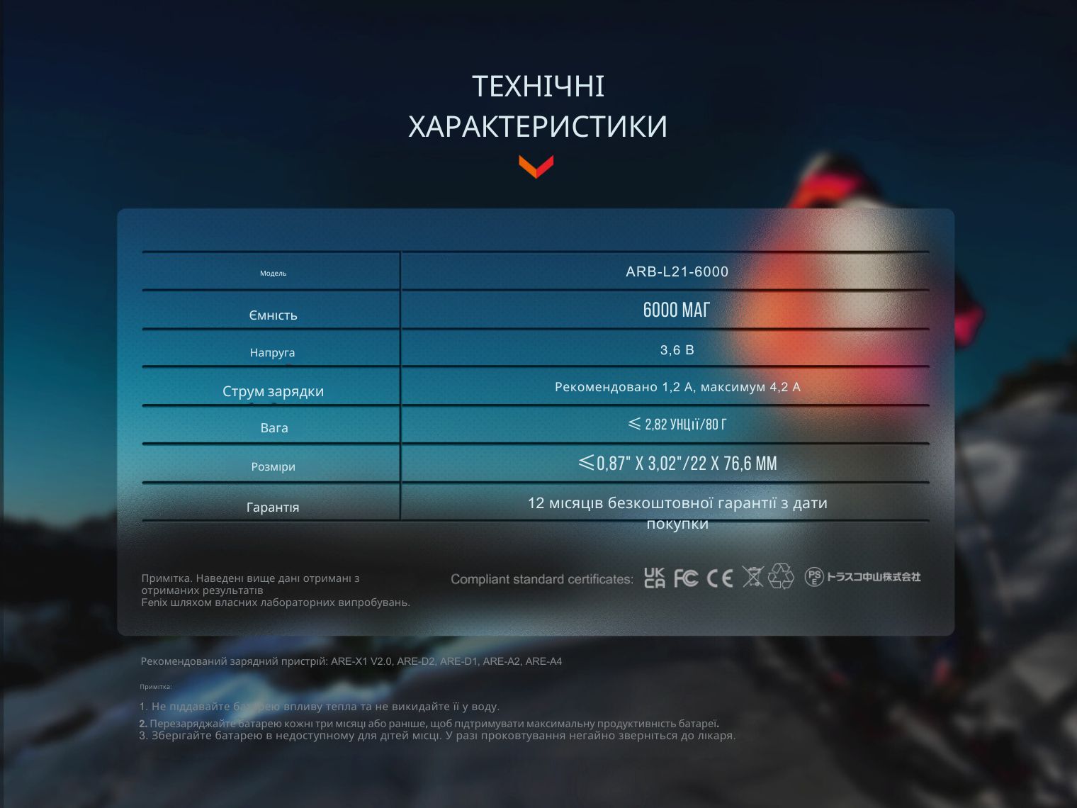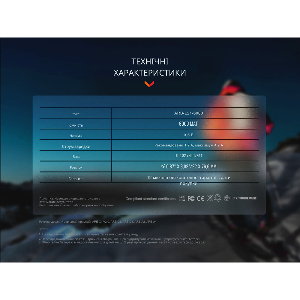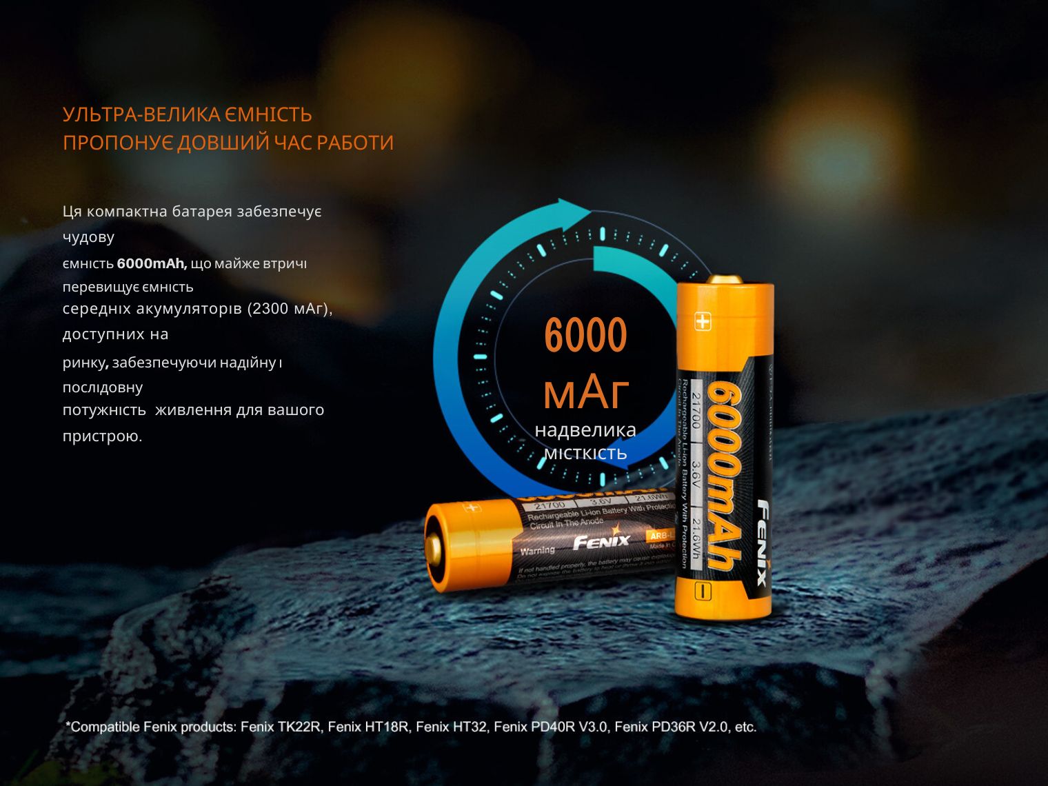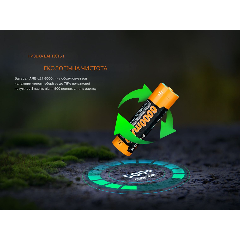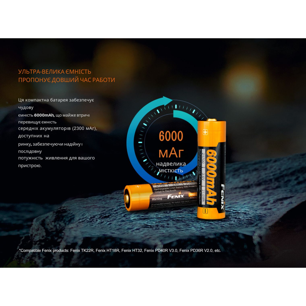 Li-ion акумулятор ARB-L21-6000 призначений для живлення пристроїв з високим енергоспоживанням, які є особливо вимогливими до ємності джерела живлення. Акумулятор також сумісний зі світлодіодними ліхтарями Fenix, зокрема з моделями TK22R, HT18R, HT32, PD40R V3.0, PD36R V2.0, LD45R тощо.