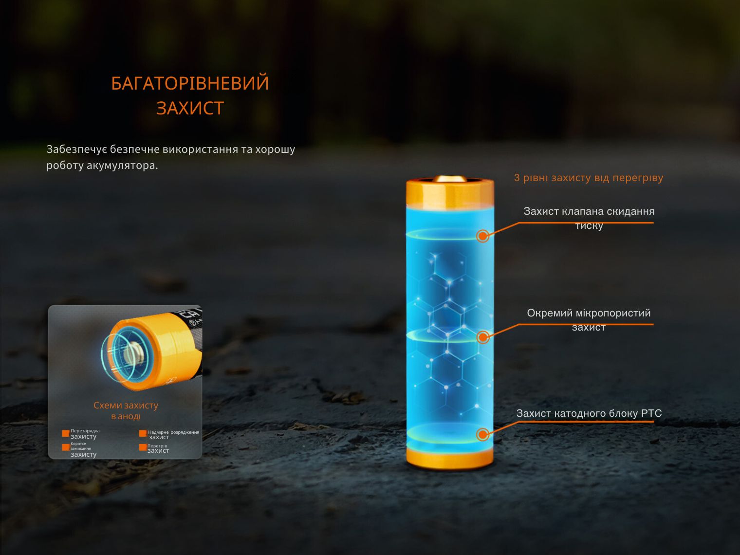 - 3-ступеневий захист. Захисний ланцюг, вбудований в анод, гарантує безпечне використання елемента живлення, запобігаючи короткому замиканню, перегріванню, перезаряджанню та перерозряджанню.