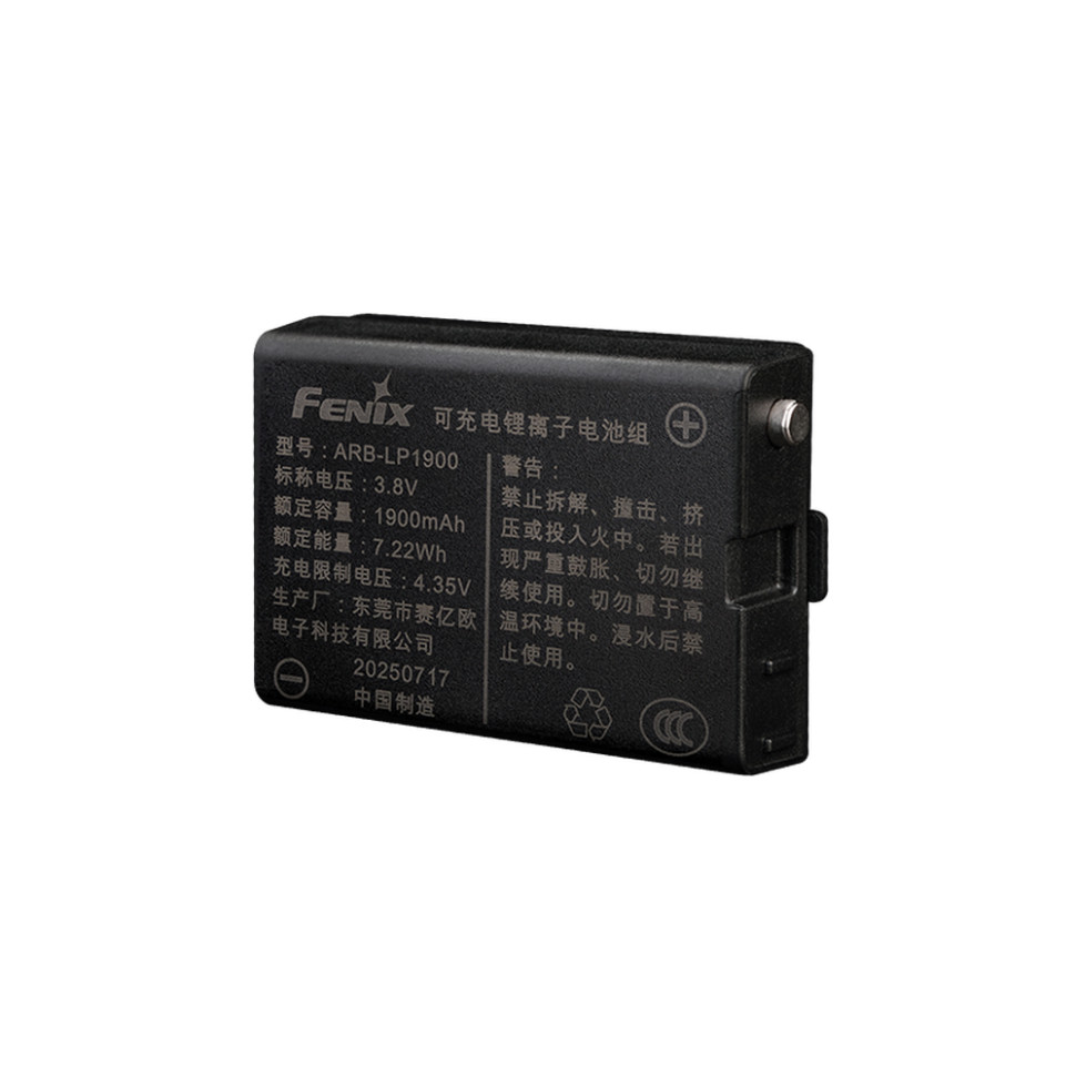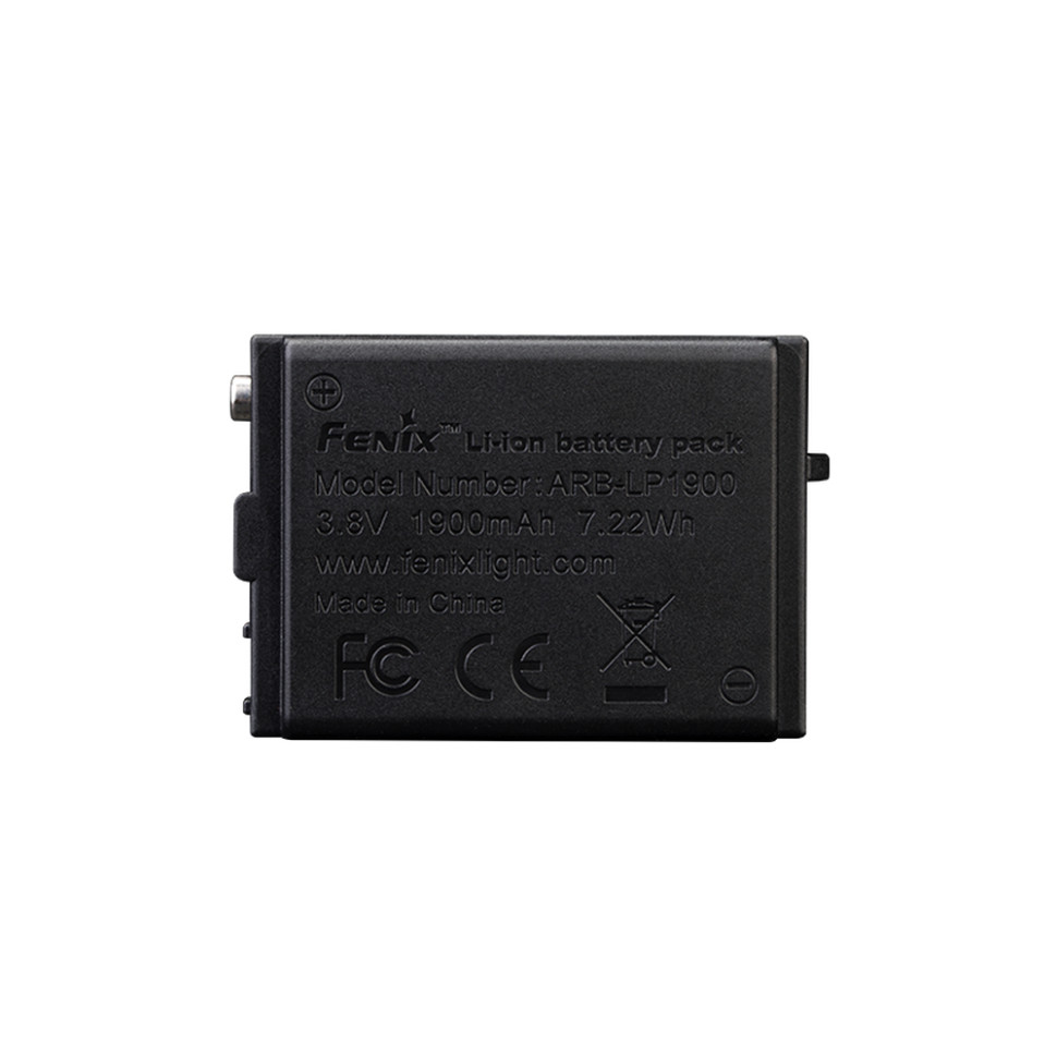 Fenix ARB-LP1900 — це фірмовий Li-Po акумулятор завтовшки 15 мм. Ємність 1900 мАг гарантує тривалу роботу ліхтаря без заміни елемента живлення. Корпус виготовлено з ABS-пластику, стійкого до механічних пошкоджень.