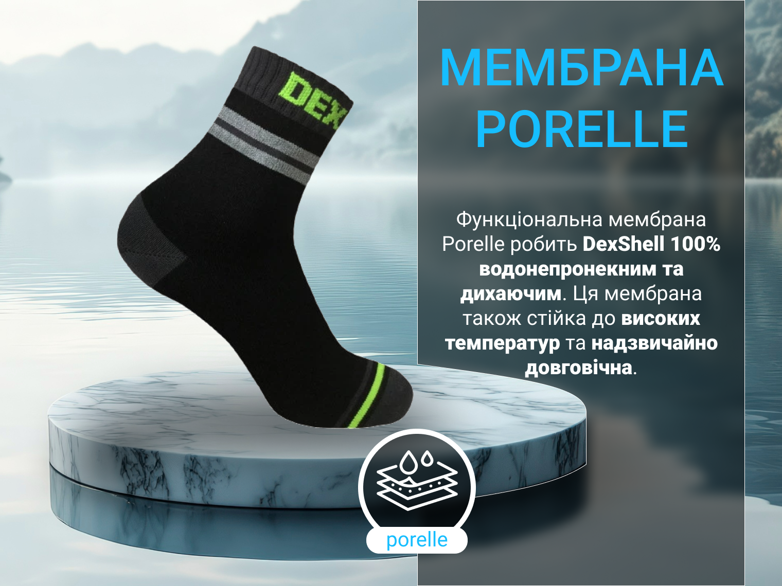 —Головний функціональний шар — мембрана Porelle®, яка виробляється в Англії. Саме вона робить шкарпетки DexShell водонепроникними, і головне — відповідає за ефективне потоотведеніе. Працює еластична і міцна мембрана Porelle® завдяки різниці температур всередині і зовні носка, саме тому не рекомендується одягати шкарпетки Dexshell Coolvent Aqua Blue поверх звичайних.