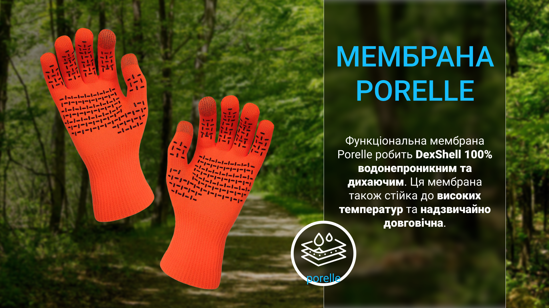 —Головний функціональний шар — мембрана Porelle®, яка виробляється в Англії. Саме вона робить рукавички DexShell водонепроникними і «дихаючими». Працює еластична і міцна мембрана Porelle® завдяки різниці температур всередині і зовні рукавичок.