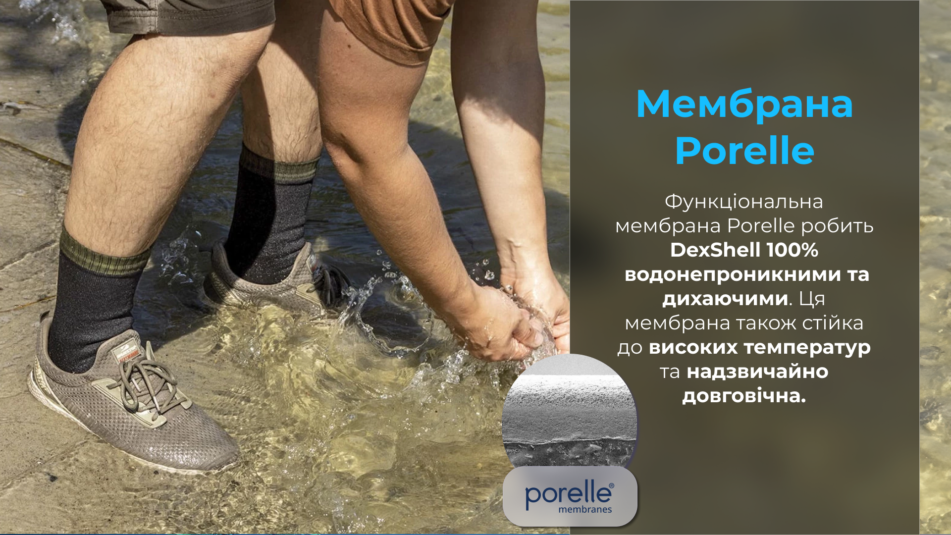 —Головний функціональний шар — мембрана Porelle®, яка виробляється в Англії. Саме вона робить шкарпетки DexShell водонепроникними, і головне — відповідає за ефективне потоотведеніе. Працює еластична і міцна мембрана Porelle® завдяки різниці температур всередині і зовні носка, саме тому не рекомендується одягати шкарпетки Dexshell Thermlite Green поверх звичайних.