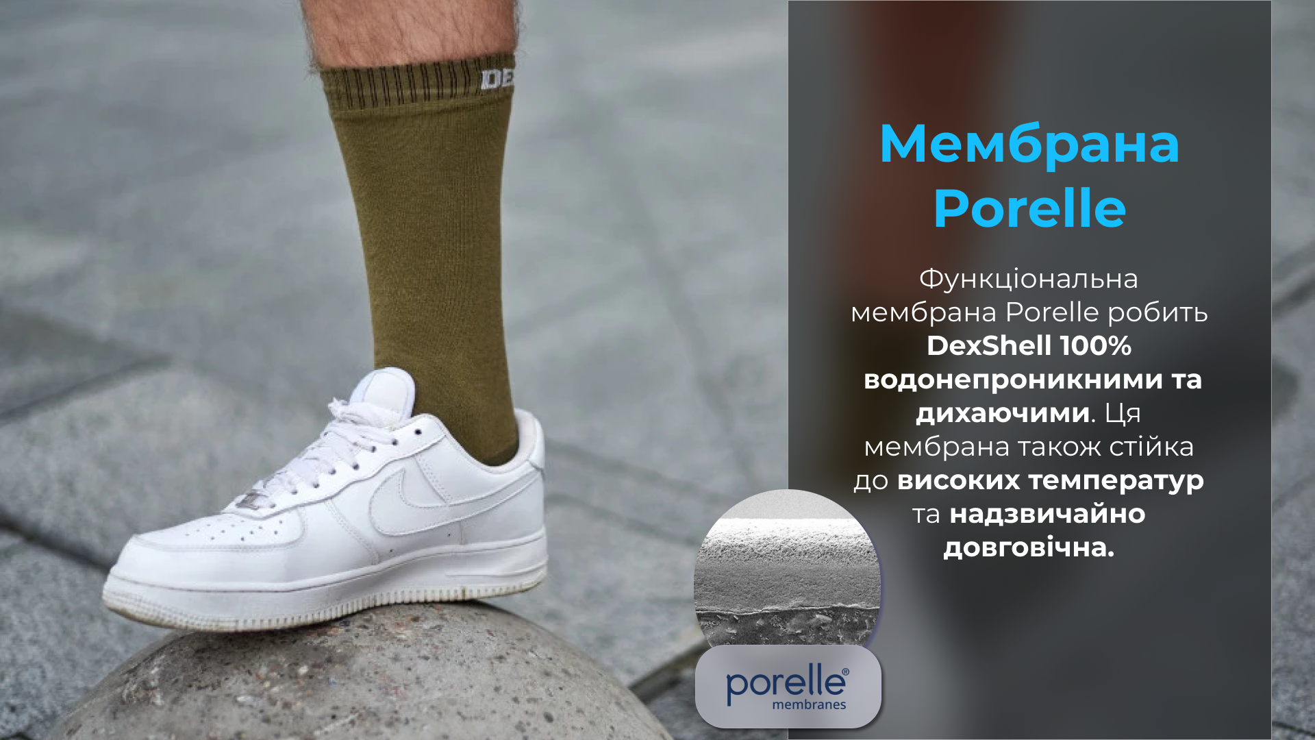 —Головний функціональний шар — мембрана Porelle®, яка виробляється в Англії. Саме вона робить шкарпетки DexShell водонепроникними, і головне — відповідає за ефективне потоотведеніе. Працює еластична і міцна мембрана Porelle® завдяки різниці температур всередині і зовні носка, саме тому не рекомендується надягати шкарпетки Dexshell поверх звичайних.
