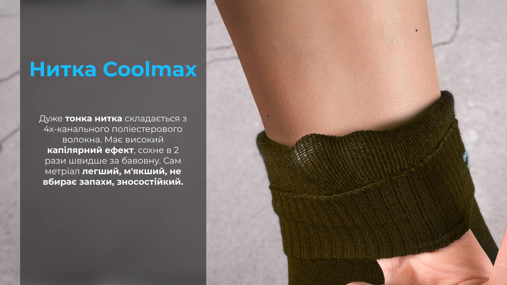 — Внутрішній шар складається з влагоотводящего волокна Coolmax®, яке виробляється американською компанією DuPont на основі поліестеру. Coolmax ® володіє антибактеріальними властивостями, а особлива структура волокна дозволяє швидко відводити вологу з поверхні тіла - що особливо важливе при інтенсивних фізичних навантаженнях.