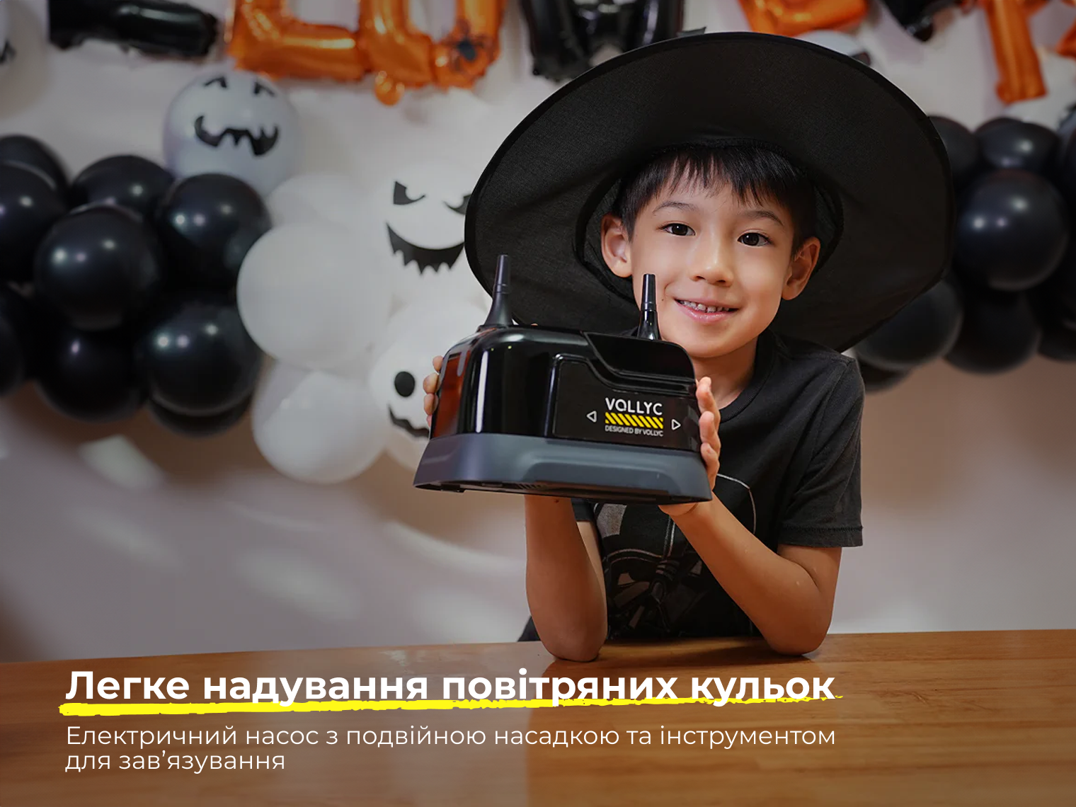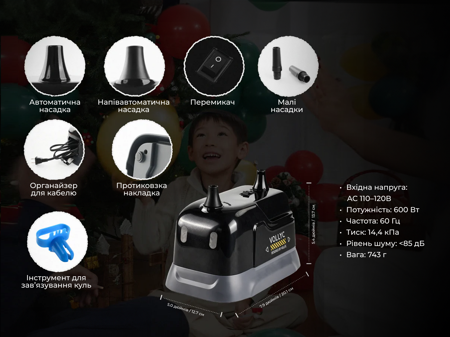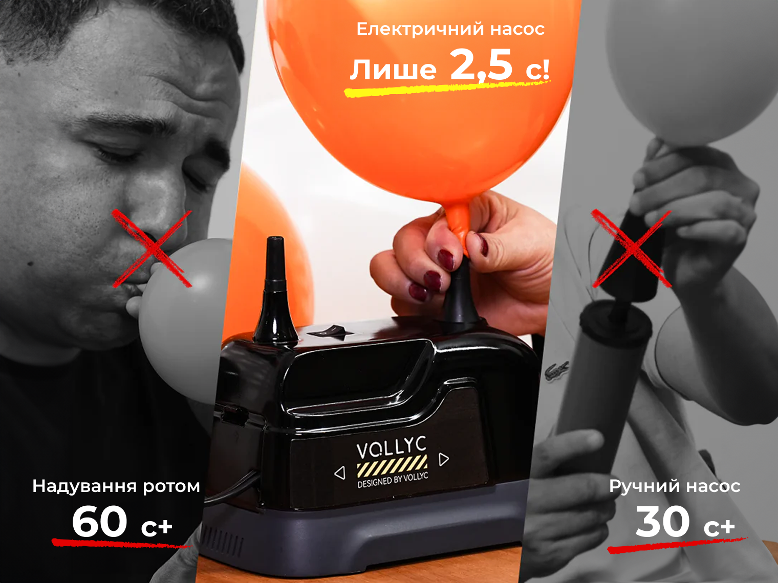 Vollyc Evo — це мережевий компресор для підготовки великої кількості кульок за короткий час. Цей електричний насос працює від розетки та наповнює стандартну кульку повітрям майже миттєво. Він замінює механічні пристрої, тож арки та фотозони збираються швидко і без фізичних зусиль.