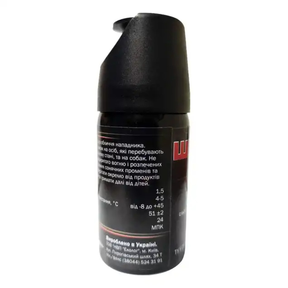 Надає ефективний захисний вплив прицільним струменем аерозолі як на собак, так і на осіб, які перебувають у стані наркотичного або алкогольного сп'яніння. Максимальна ефективність застосування препарату досягається на відстані до 3 метрів.