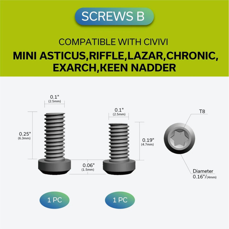 - сумісні моделі ножів – Civivi Baklash, Praxis, Chevalier, Mini Asticus, Riffle, Lazar, Chronic, Exarch, Keen Nadder / WeKnife Elementum, Upshot, Subjugator, Culex, Soothsayer / Sencut Brazoria;