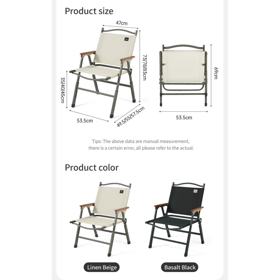 Габарити в розкладеному вигляді становлять 53.5 х 63 х 73 / 78 / 83 см залежно від встановленої висоти ніжок. У складеному вигляді розміри зменшуються до 53.5 х 69 х 10 см. Вага крісла — лише 3.7 кг, що робить його чудовим варіантом для виїздів на природу, коли важливі зручність й портативність.