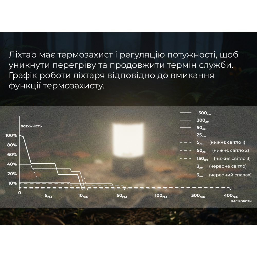 - Низький: 50 люмен – 40 годин;