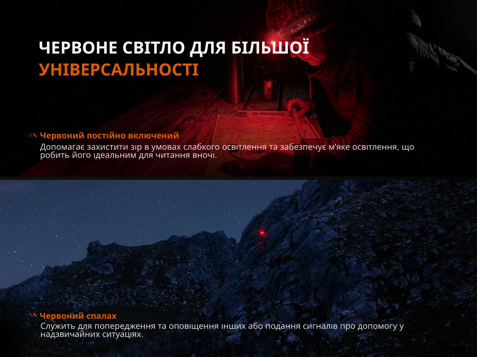 Вам доступні 4 режими білого світла, а також 2 варіанти з червоним променем: постійний червоний для м'якого підсвічування та миготливий для подачі світлових сигналів та привернення уваги.