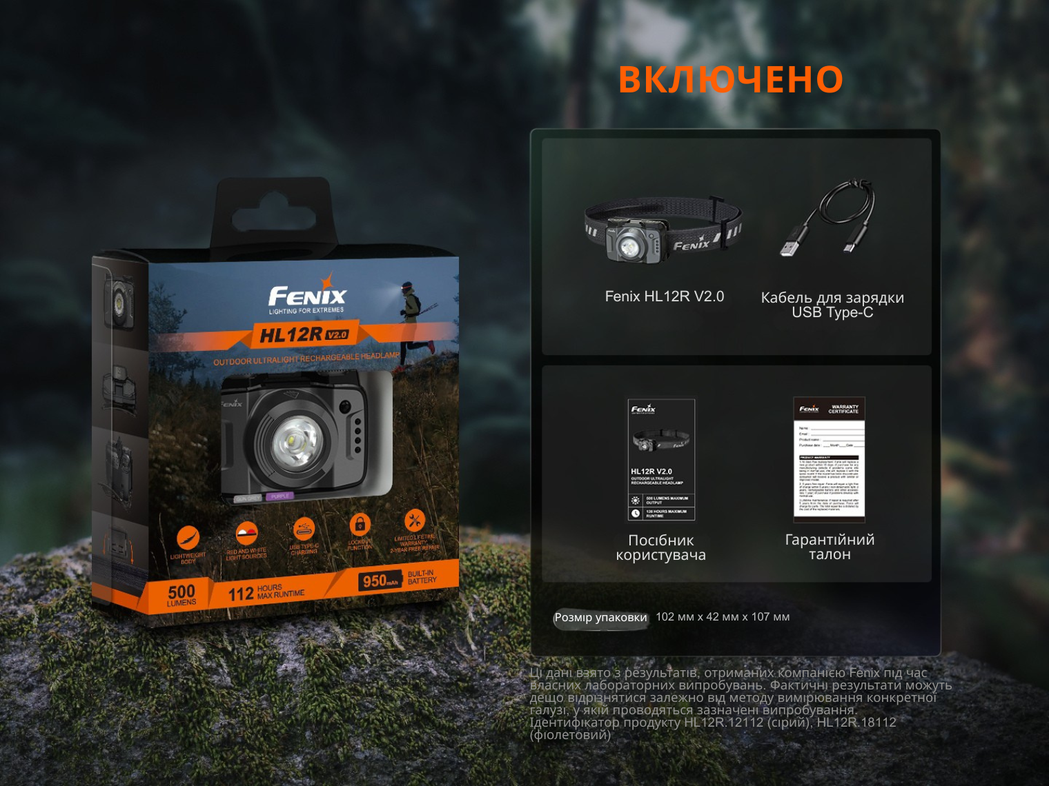 Налобний ліхтар Fenix HL12R V2.0, зарядний кабель USB Type-C, інструкція користувача, гарантійний талон.