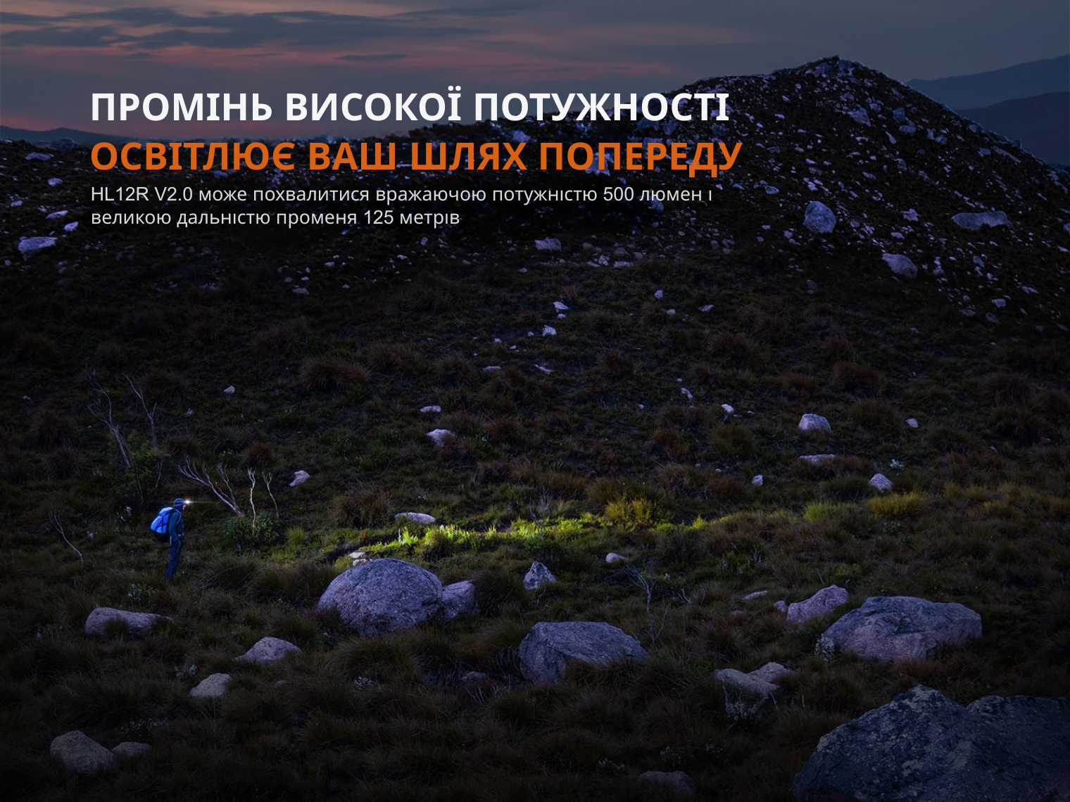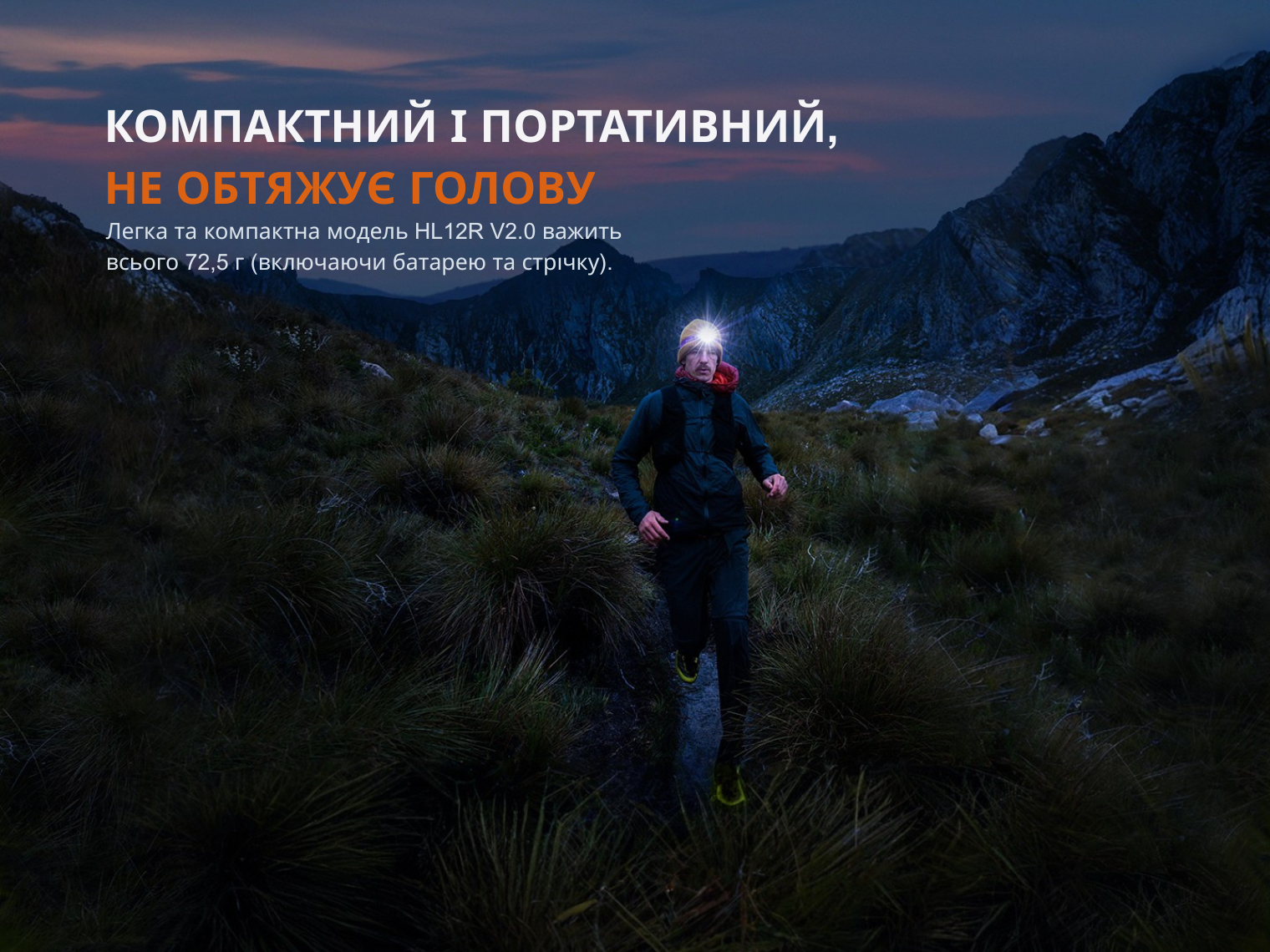 Налобний ліхтар Fenix HL12R V2.0 — компактна модель з надлегкою вагою (72,5 г з урахуванням кріплення), що робить її ідеальним компаньйоном для освітлення на активному відпочинку, трекінгу, в кемпінгу та під час спортивних бігових тренувань.