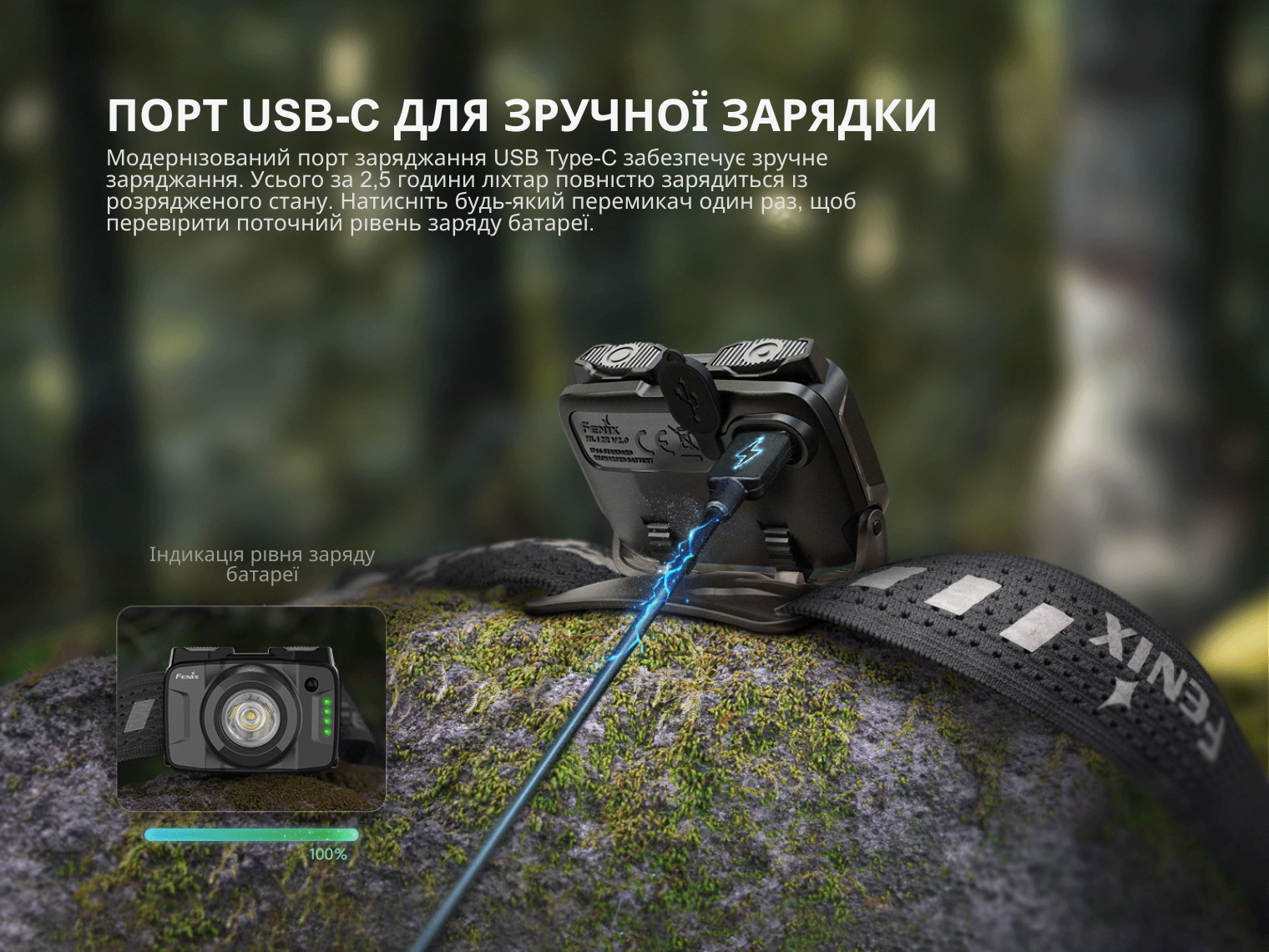 Fenix HL12R V2.0 живиться від вбудованого акумулятора ємністю 950 мАгод. Заряджання здійснюється через порт USB Type-C в задній частині корпусу та триває 2,5 год за умови використання зарядного адаптера 5 В / 1 А або вище.