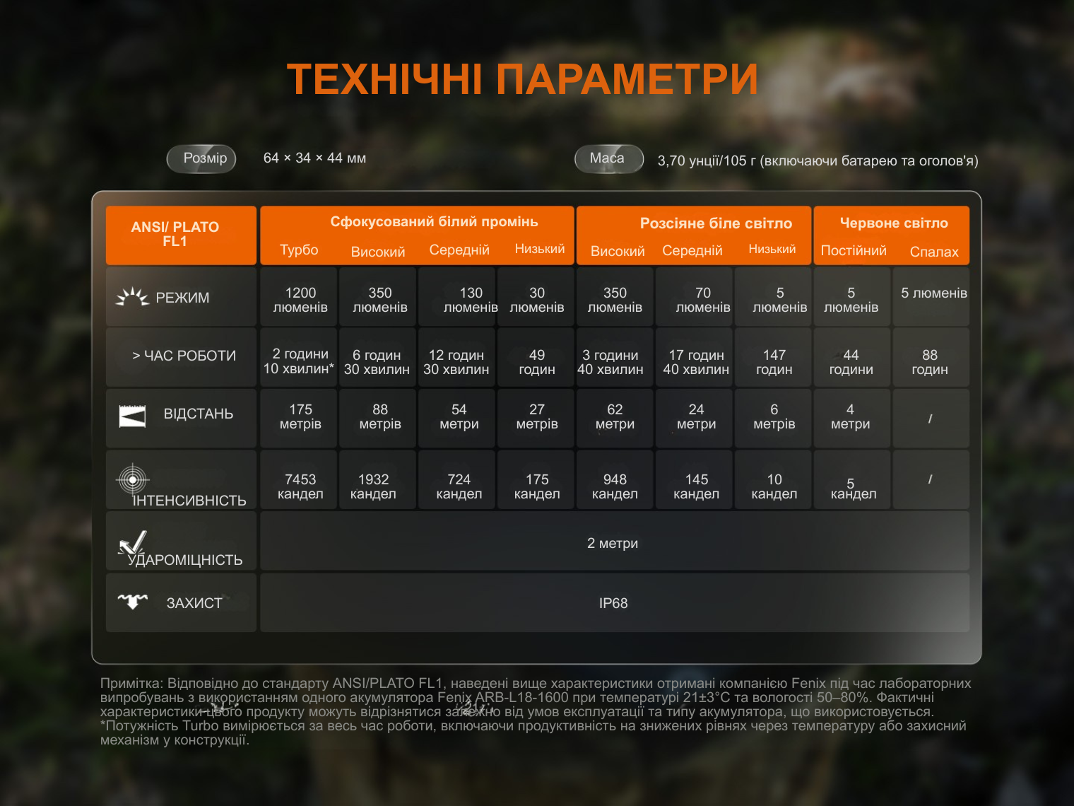 - Турбо: 1200 лм – 7453 кд – 2 год 10 хв – 175 м;