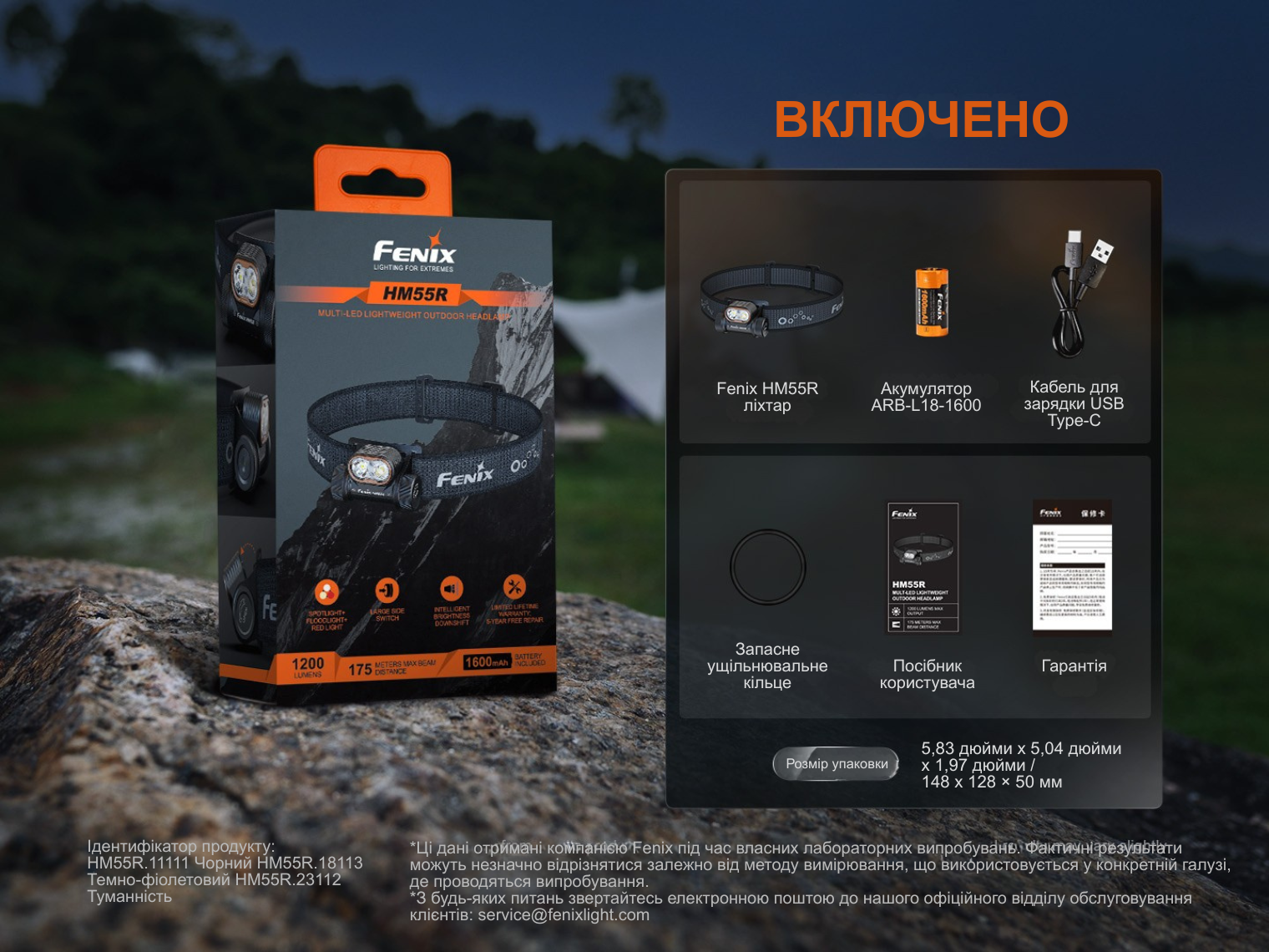 Ліхтар Fenix HM55R з резинкою на голову, акумулятор ARB-L18-1600, кабель USB-C для заряджання, запасне ущільнювальне кільце, інструкція користувача, гарантійний талон.