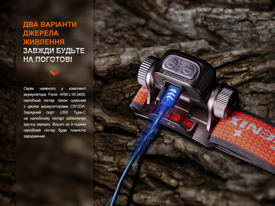 Для заряджання акумулятора не потрібно виймати його з батарейного відсіку — для цього передбачено зарядний порт USB Type-C у задній частині корпусу ліхтаря. Повне заряджання займає близько 3 год.