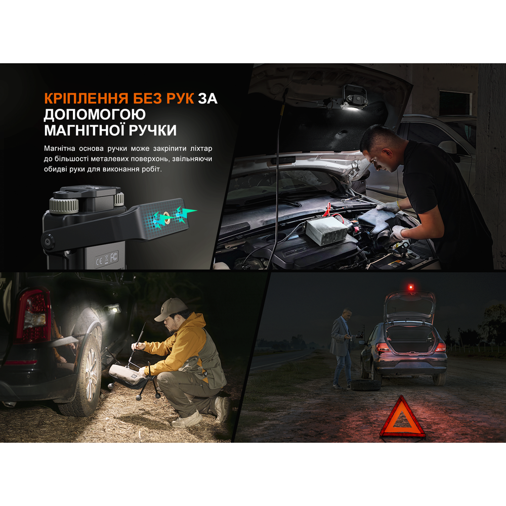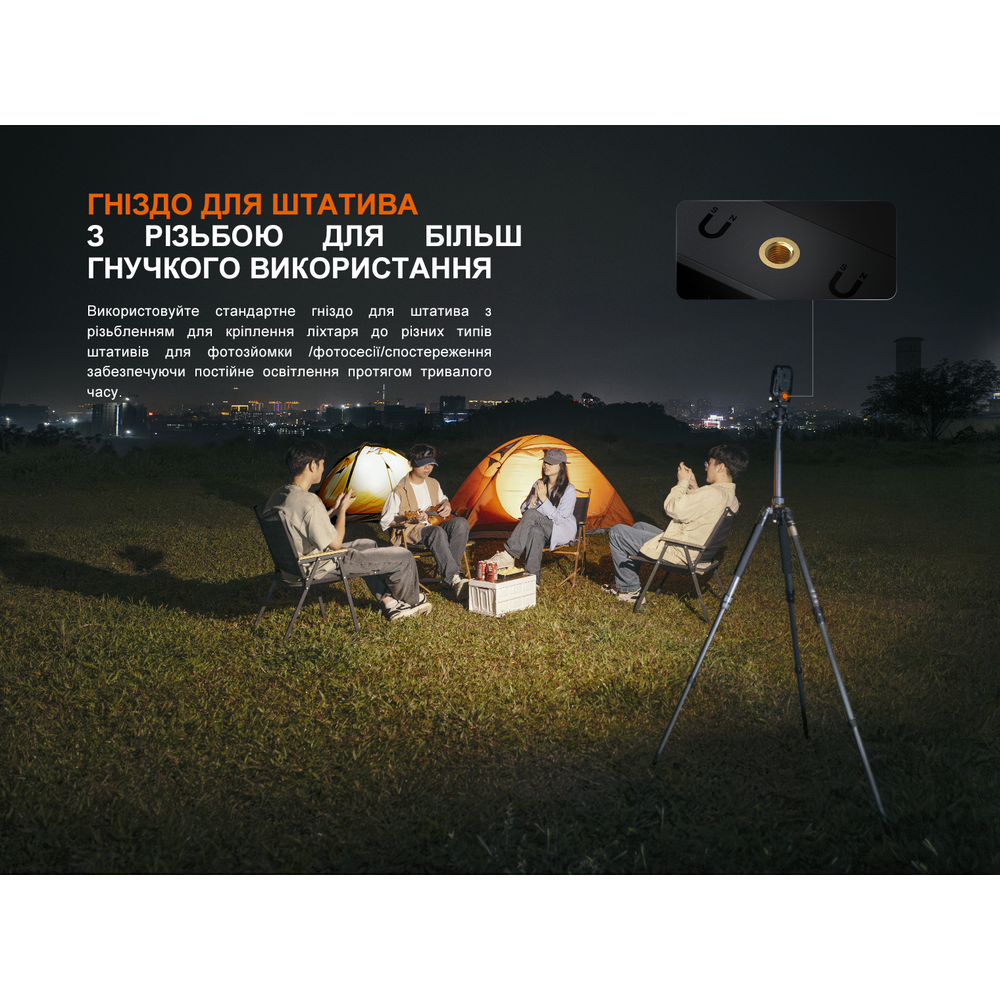Ліхтар можна встановлювати будь-яким зручним способом: кріпити на штативі з різьбовим з'єднанням, підвішувати та фіксувати на металевій поверхні за допомогою магнітної ручки, що обертається на 360°, або ставити на стіл, використовуючи як мініатюрний світильник.