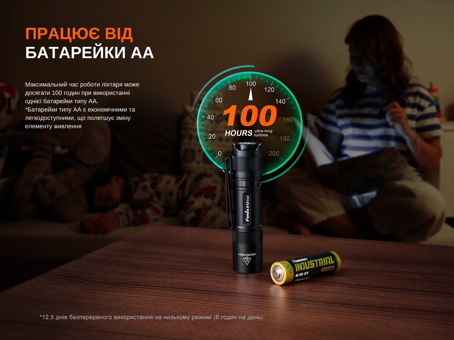 Fenix E12 V3.0 — це НЕ перезаряджуваний ліхтар. Він живиться від однієї батареї АА з номінальною напругою 1,2 В (для Ni-NH батарей) або 1,5 В (для лужних та літієвих аналогів).