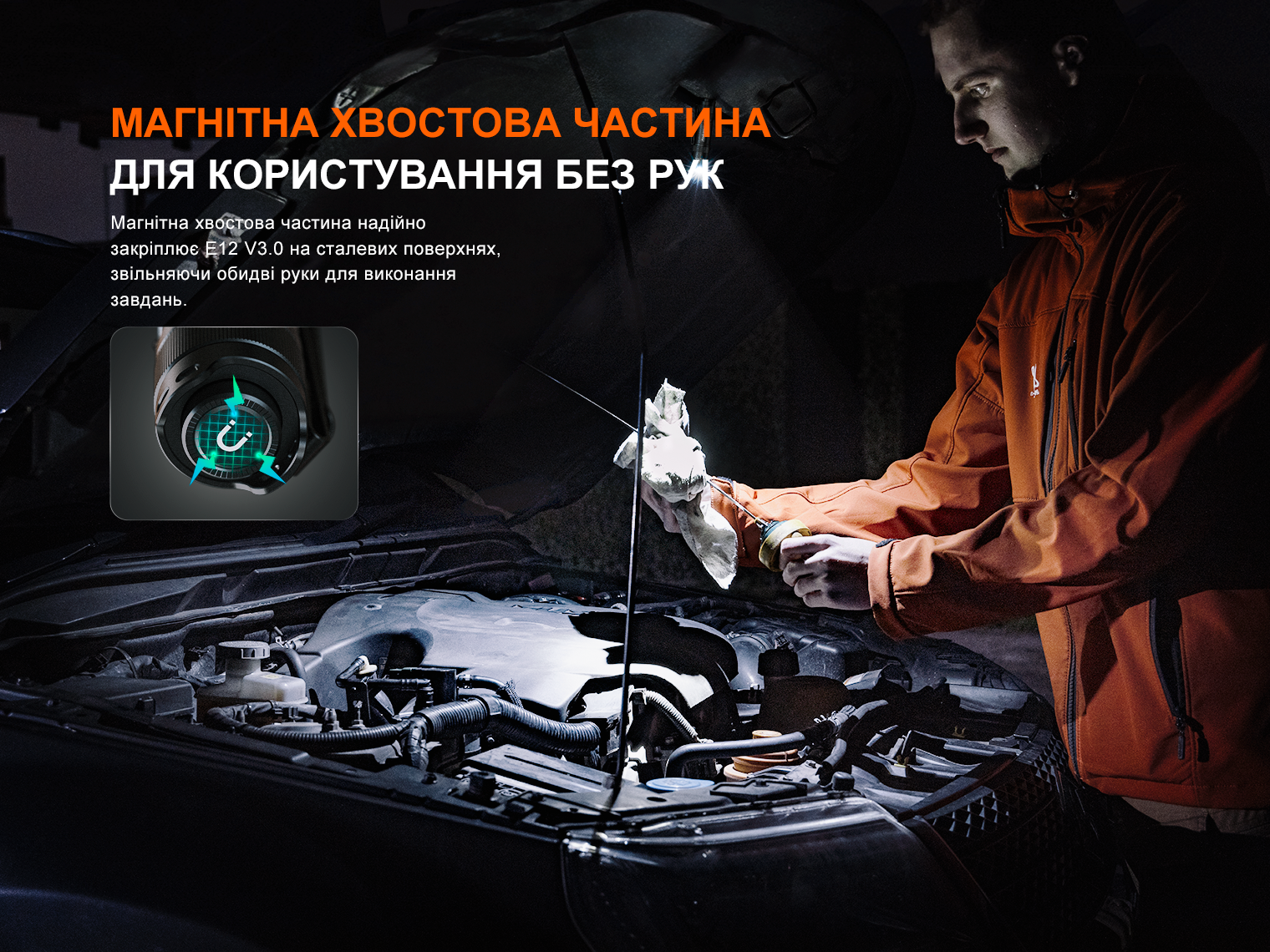 Наявність функціональних рішень у вигляді магніту в хвості для фіксації на металевих поверхнях, знімної двосторонньої кліпси, а також можливість встановлення конструкції в положенні свічки робить з пристрою універсального та зручного в експлуатації помічника як для дому, так і для використання в автосервісі або під час подорожей.