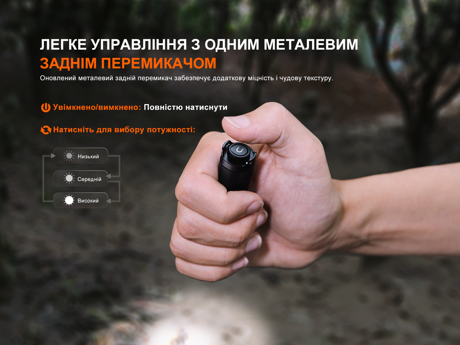 Керування здійснюється однією металевою кнопкою у хвості: натискання до упору вмикає та вимикає світло, а напівнатискання без клацання перемикають яскравість за збільшенням потужності.