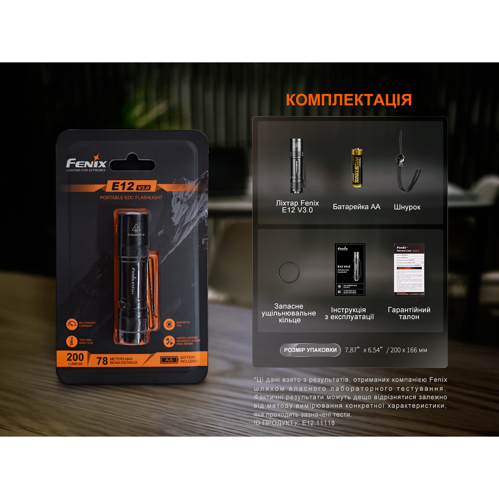 Ліхтар Fenix E12 V3.0, батарейка АА, запасне ущільнювальне кільце, темляк, гарантійний талон, інструкція користувача.