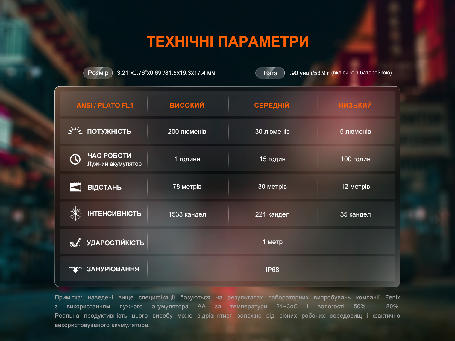 - Високий: 200 лм – 1533 кд – 1 год – 78 м;