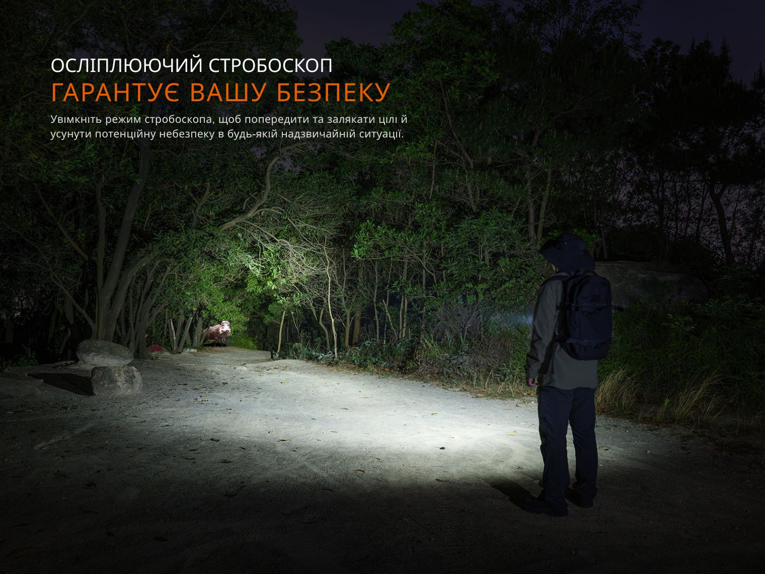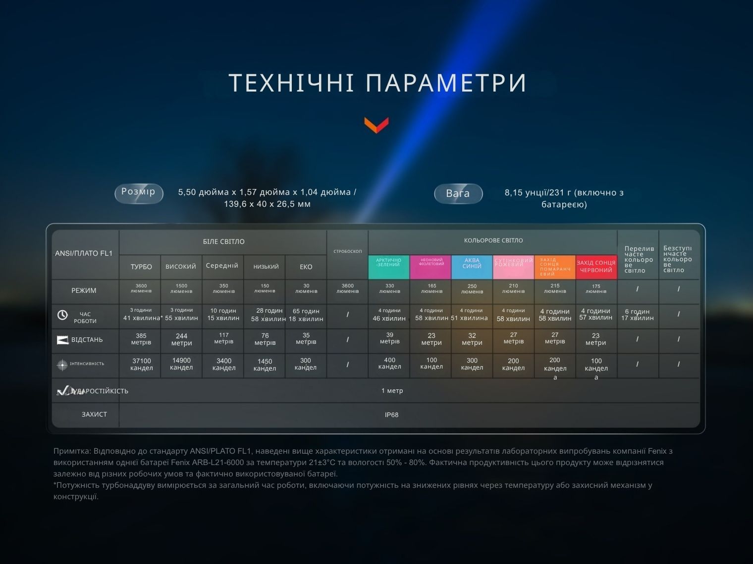 - Турбо: 3600 лм – 37100 кд – 3 год 41 хв – 385 м;