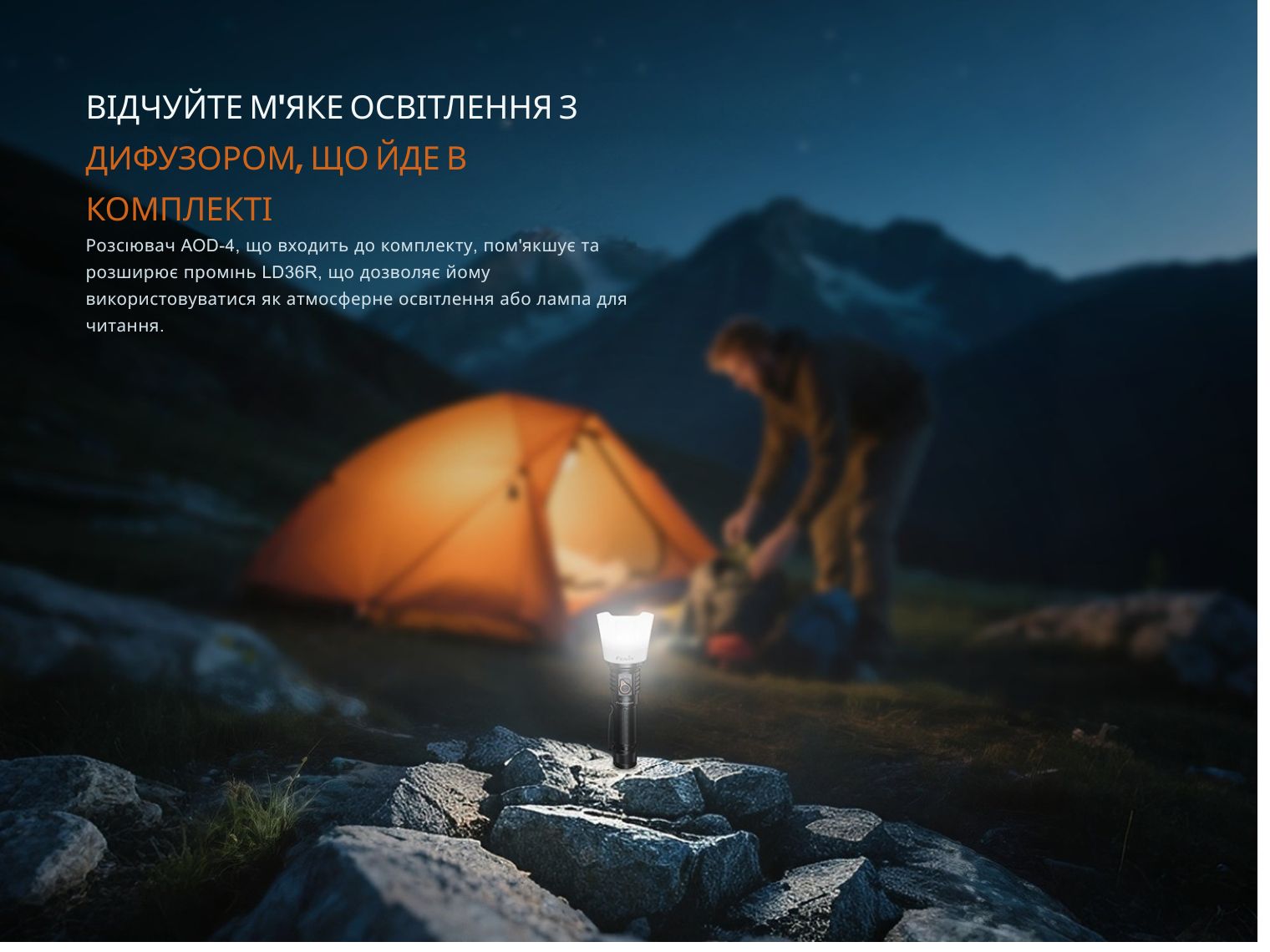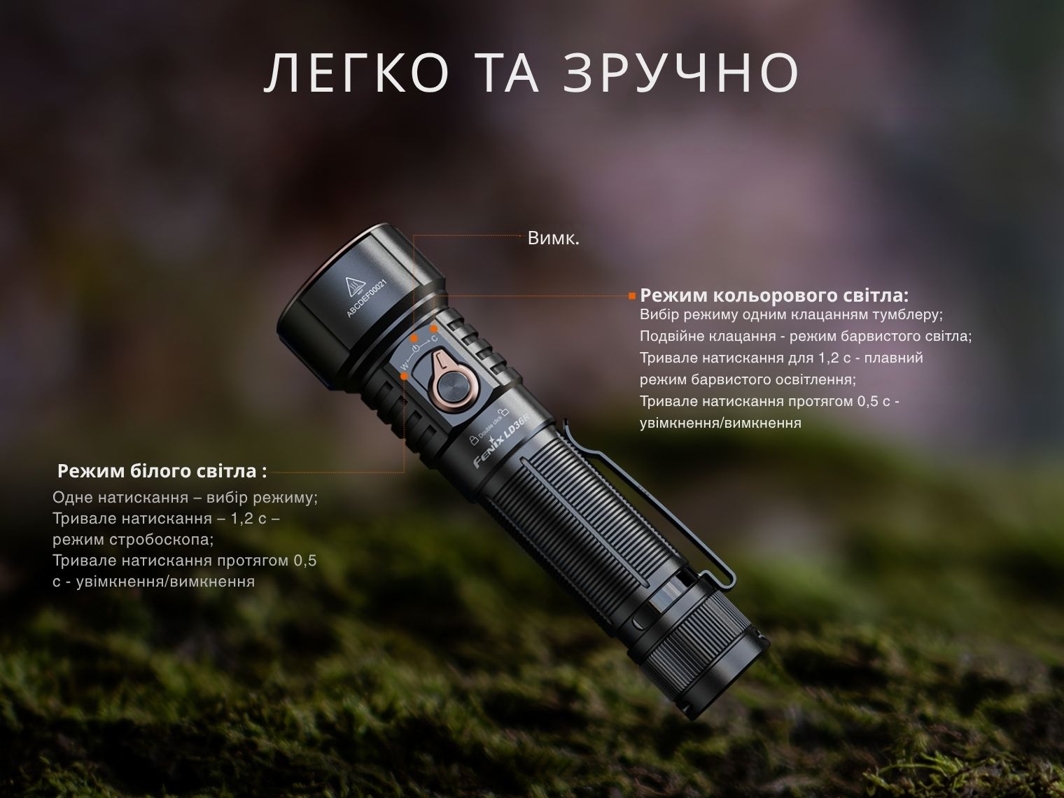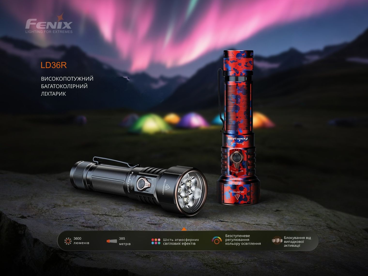 Багатоцільовий ліхтар Fenix LD36R виконує функції ручного джерела освітлення та кольорового прожектора, що робить його ідеальним вибором не лише для повсякденного використання і туризму, а й для фото- та відеозйомок.
