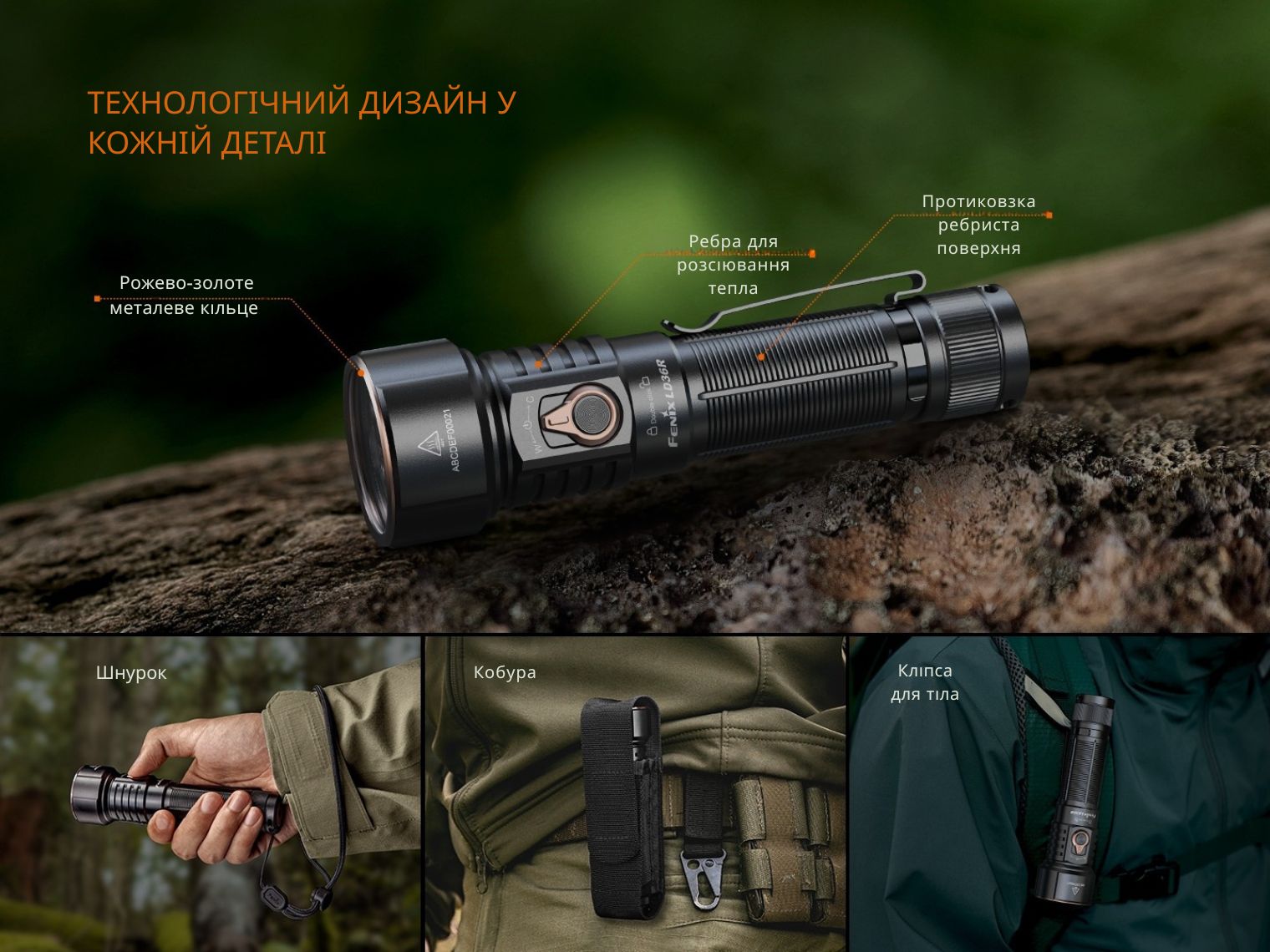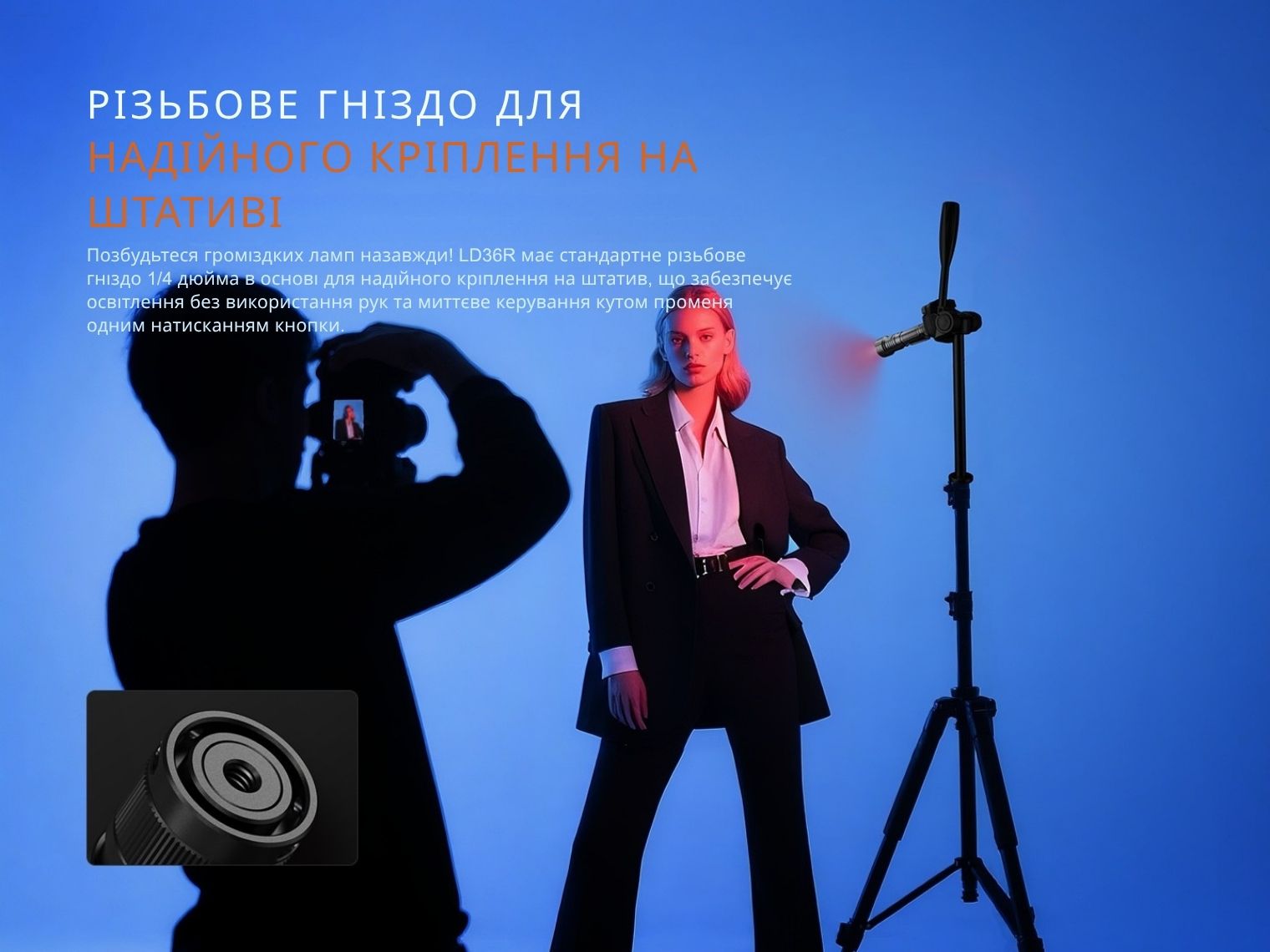 Fenix LD36R комплектується знімною кліпсою для фіксації на сумці або кишені. У хвості є різьблення 1/4" для кріплення ліхтаря на штативі.