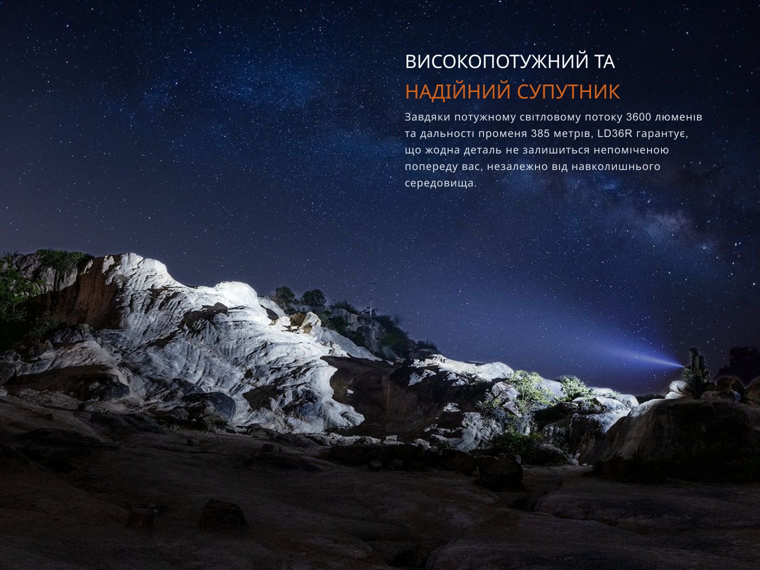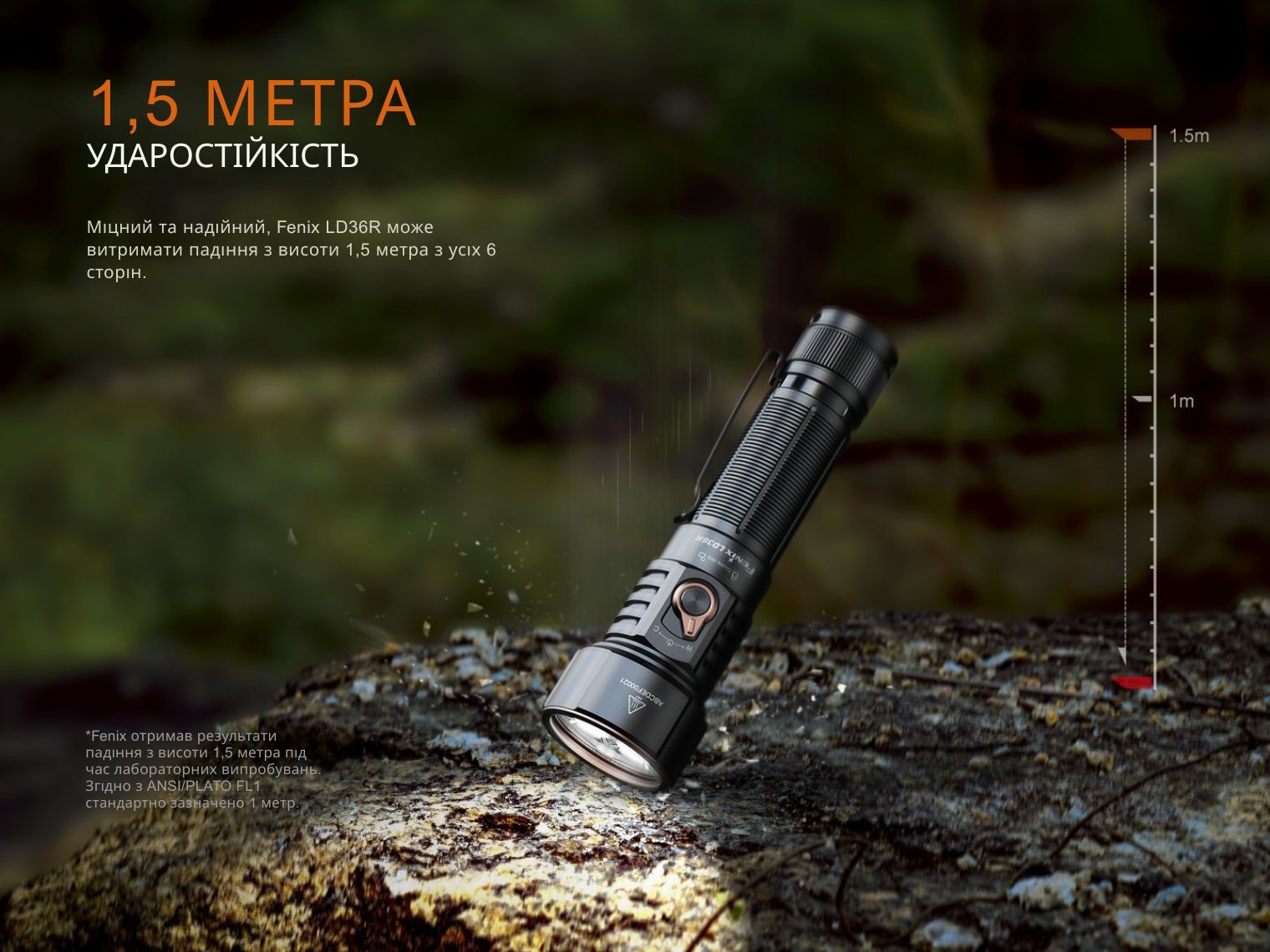 Fenix LD36R живиться від надʼємного акумулятора Fenix на 6000 мАгод (є в комплекті). Інтелектуальний захист унеможливлює ламання електроніки у разі встановлення батареї неправильною стороною.