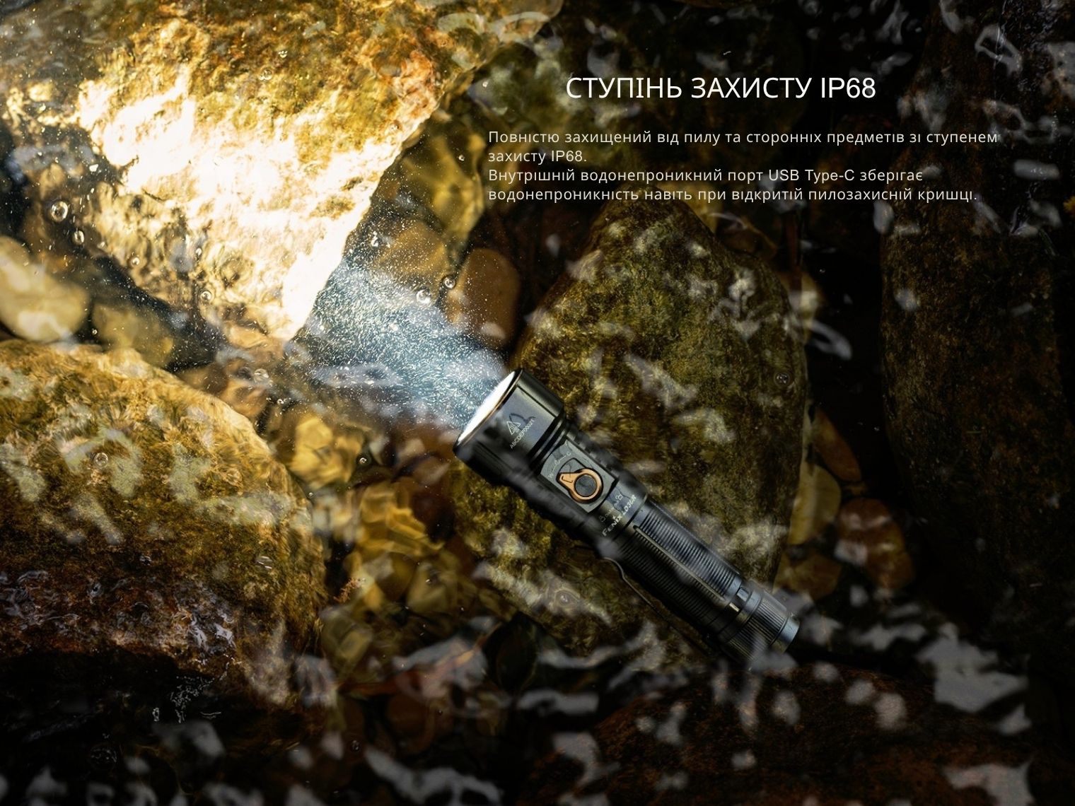Конструкція не боїться падіння з висоти 1 м і прямого контакту з вологою. Герметичність за стандартом IP68 гарантує повну водонепроникність стиків з можливістю роботи ліхтаря навіть у разі занурення у воду.