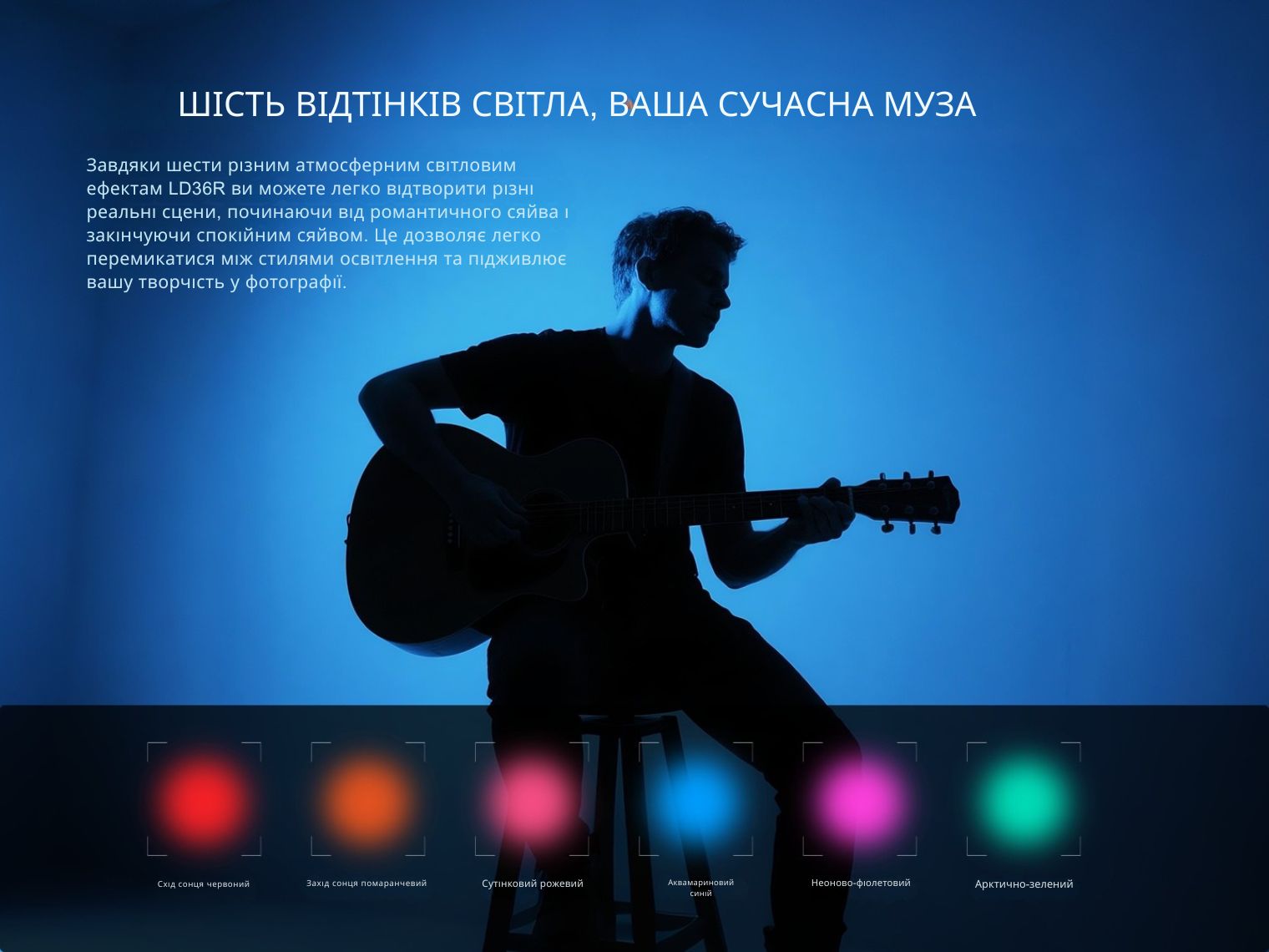 Кольорові діоди випромінюють світло у 6 різних відтінках, дозволяючи налаштовувати освітлення під поточний настрій та потреби для створення контенту. Термін служби кожного світлодіода складає 50000 год.