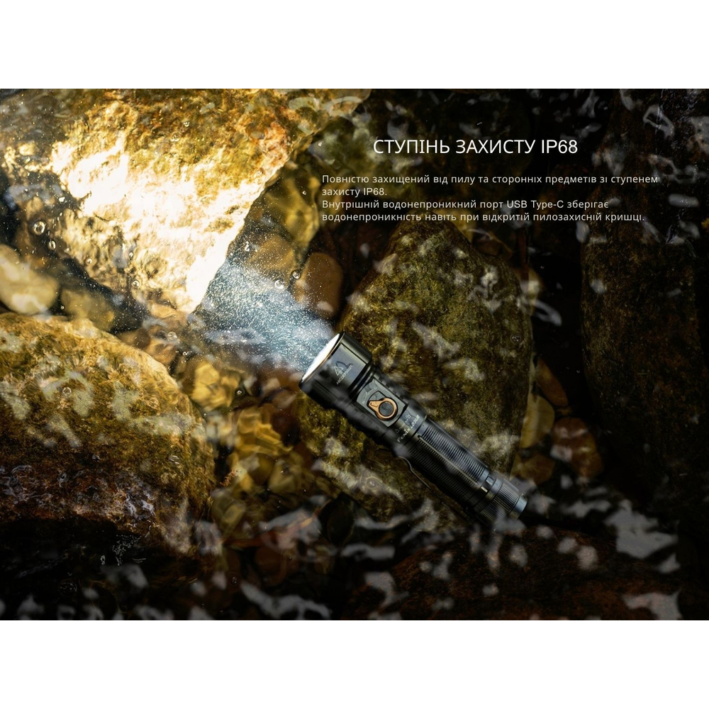 Конструкція не боїться падіння з висоти 1 м і прямого контакту з вологою. Герметичність за стандартом IP68 гарантує повну водонепроникність стиків з можливістю роботи ліхтаря навіть у разі занурення у воду.