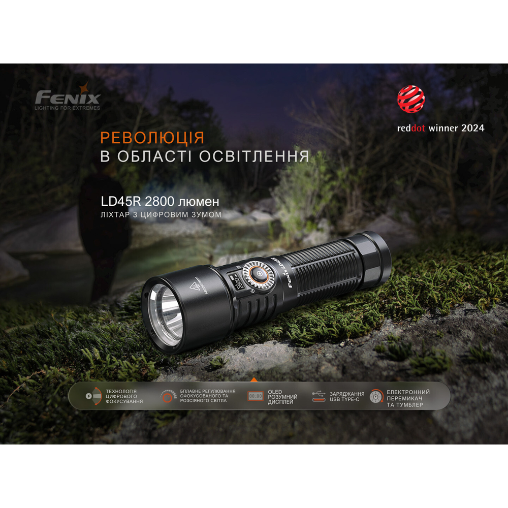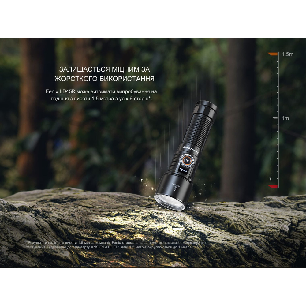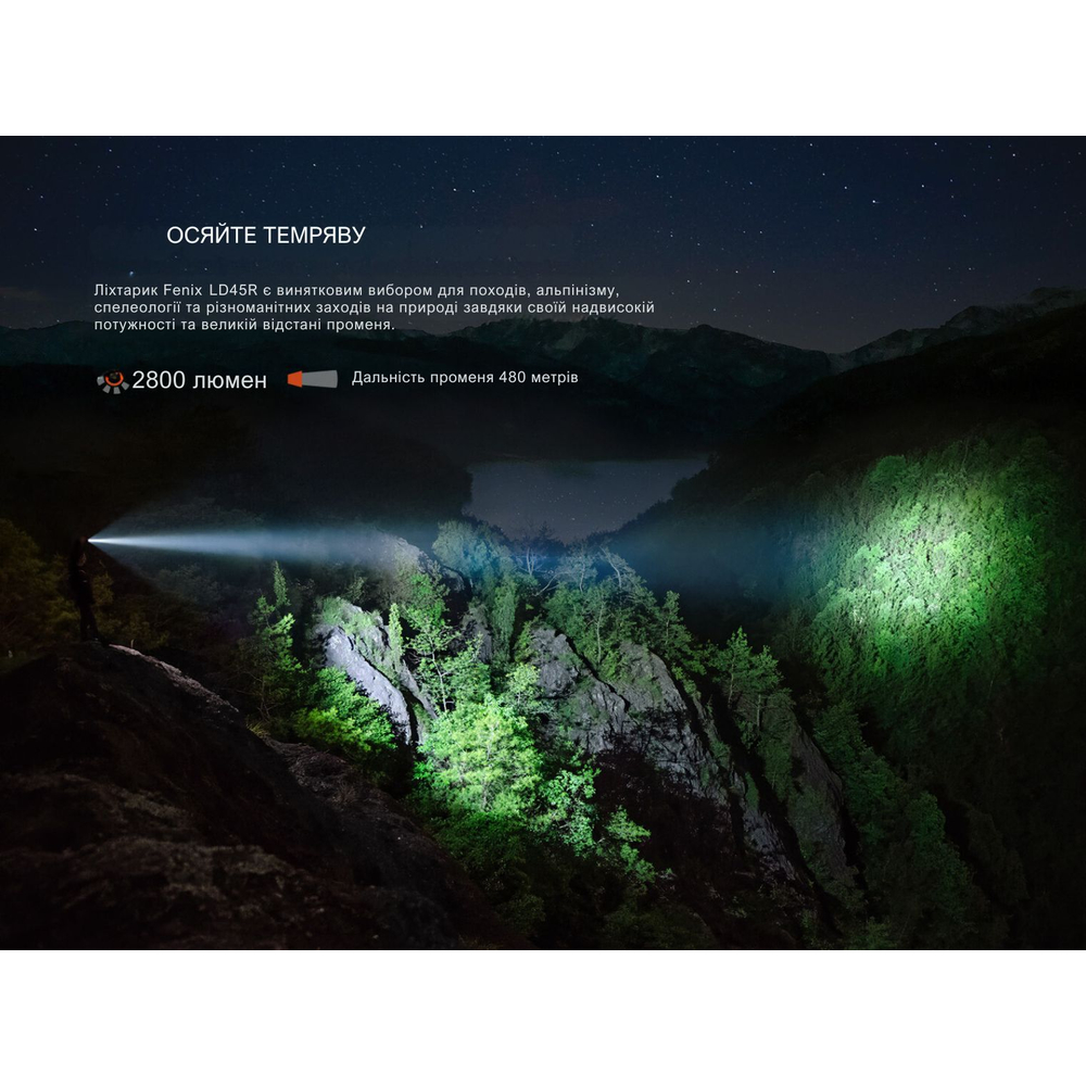 Ліхтар Fenix LD45R, акумулятор Fenix ARB-L21-5000 V2.0, кабель для заряджання USB Type-C, запасне ущільнювальне кільце, темляк, чохол для носіння на поясі, інструкція користувача, гарантійний талон.