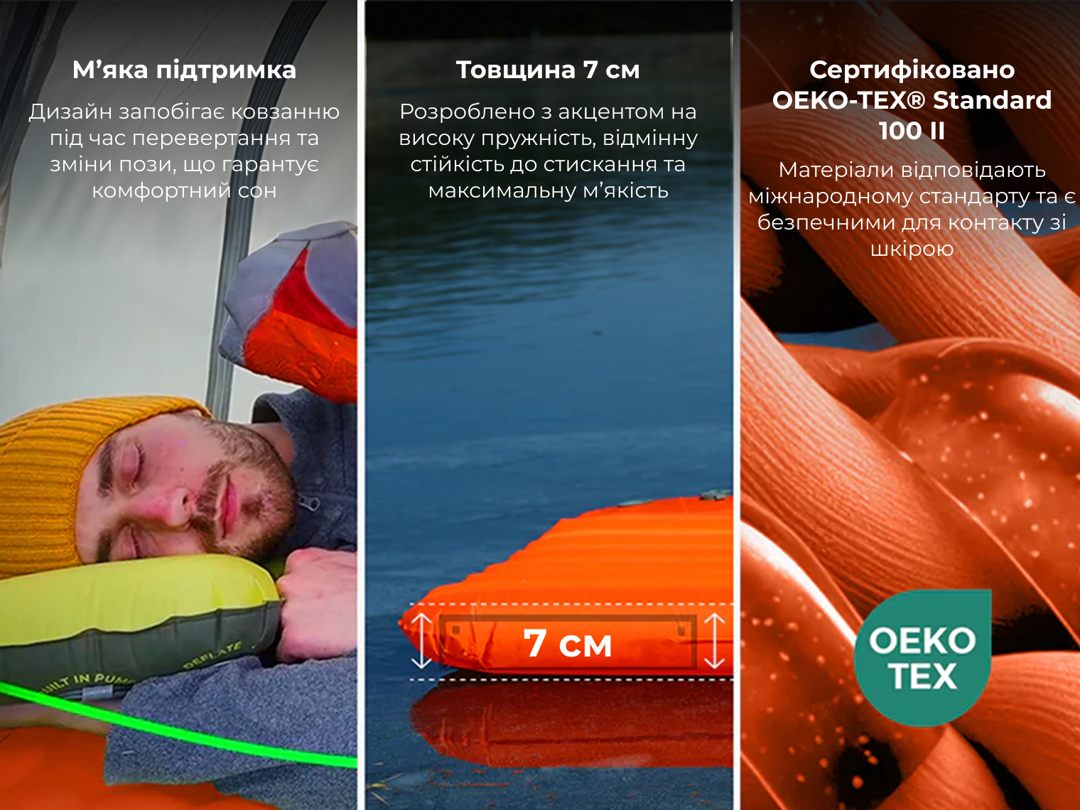 Матрас важить 766 г завдяки поєднанню нейлону 20D та синтетичного утеплювача. При такій легкості виріб має ширину 65 см та товщину 7 см, яка нівелює нерівності рельєфу та забезпечує правильну підтримку хребта.