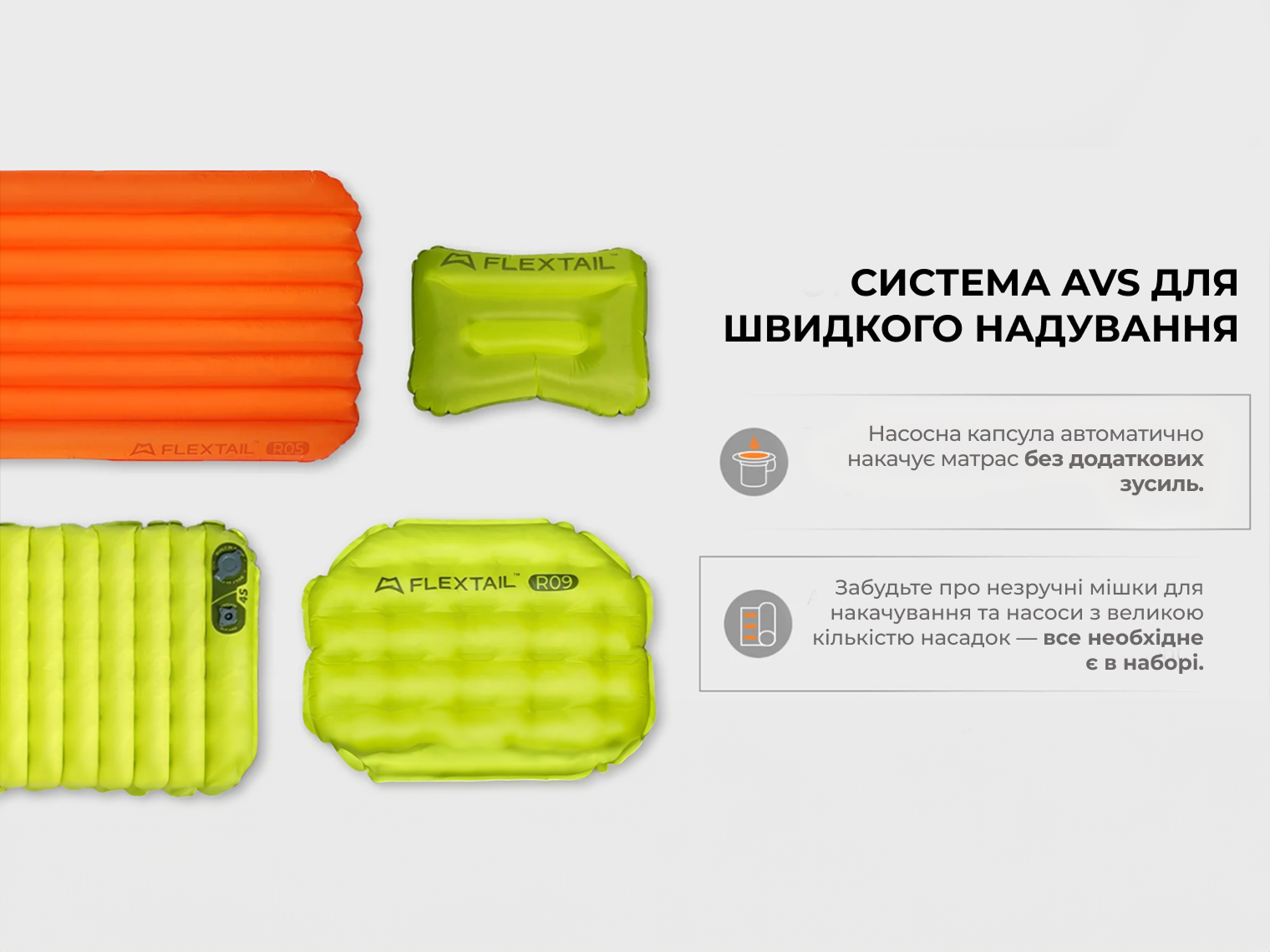 Опис матраса туристичного самонадувного Flextail R05 AVS Mummy надлегкого, 183х65х7 см з насосною капсулою AVS, помаранчевого: