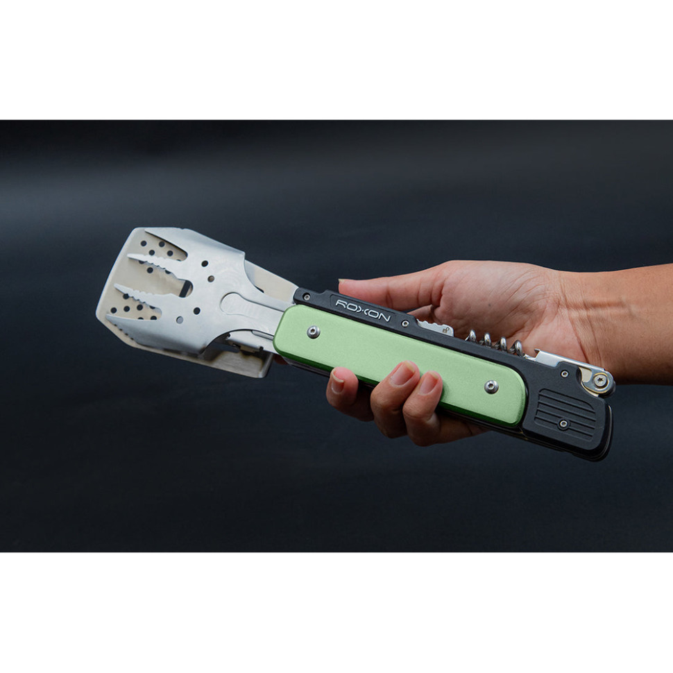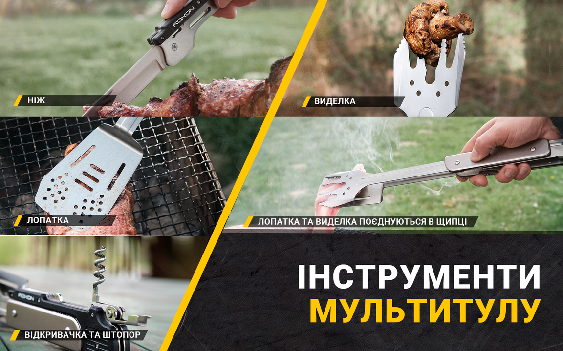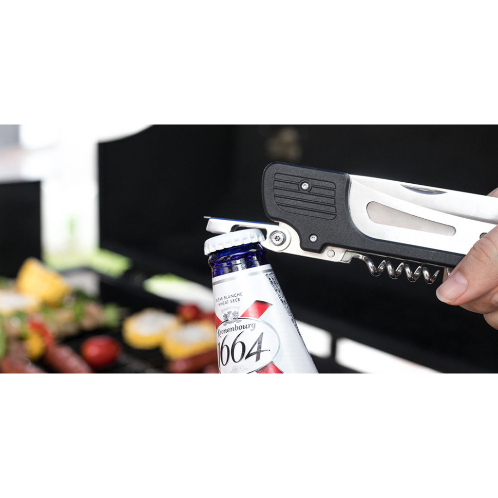 Мультитул для барбекю Roxon S601 — це складаний інструмент 6-в-1, який поєднує всі необхідні прилади для приготування та подачі страв на грилі. У наборі є виделка, лопатка, щипці, ніж, відкривачка для пляшок та штопор.