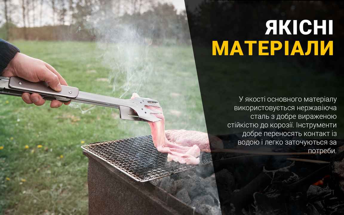 Виделка та лопатка сконструйовані для безпечного приготування на грилі та мангалі. Широка лопатка дозволяє швидко перевертати стейки, котлети та овочі, а гострі зубці виделки підходять для перевірки ступеня прожарювання.