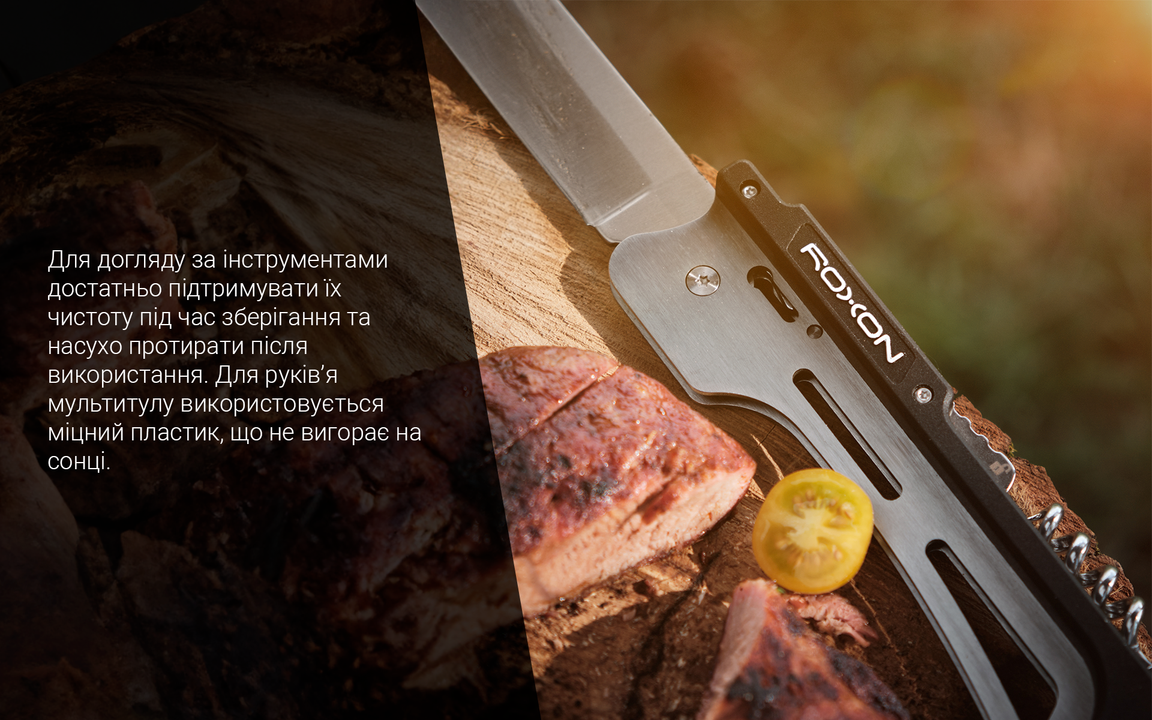 Ніж Drop Point з прямим заточуванням спрощує нарізання та обробку харчових продуктів, допомагає перевірити готовність стейка та розділити страву на порції для подачі. Відкритий клинок завдовжки 13 см фіксується за допомогою механізму Safety lock, який не дає лезу скластись під час навантаження. Ніж ховається в руківʼя мультитула для транспортування.