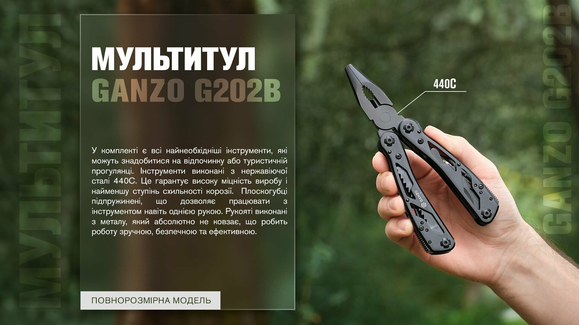 Ganzo G202B — універсальний мультитул для туризму, активного відпочинку та щоденного використання. Завдяки 24 функціям він замінює цілий набір інструментів, залишаючись компактним елементом вашого спорядження: