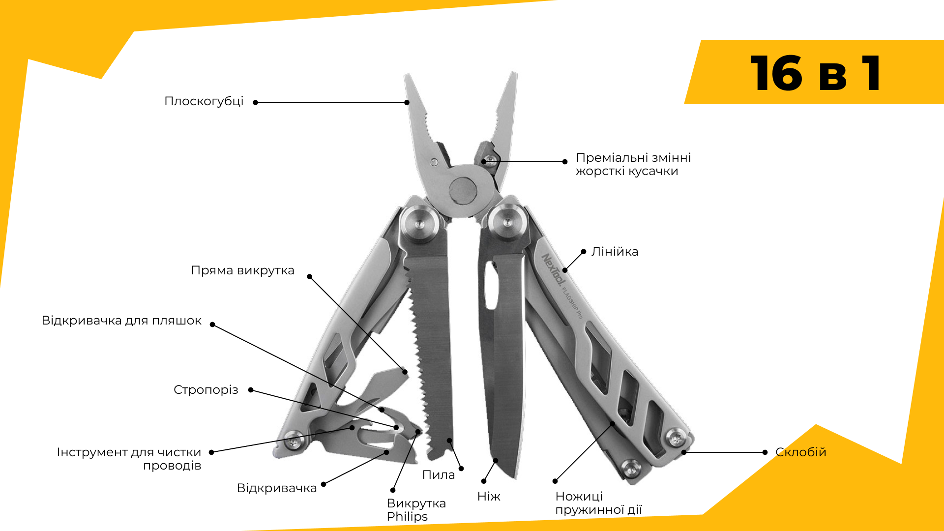 Мультиінструмент NexTool Flagship Pro NE20220 розробили з метою повсякденного застосування. Маленький функціональний виріб виручає користувача в самих різних життєвих ситуаціях. Модель завжди під рукою, і радує зручністю. Вона універсальна. Поєднує в собі ряд пристосувань, часто застосовуються на практиці. Всього мультитул поєднує 16 інструментів. А саме:
