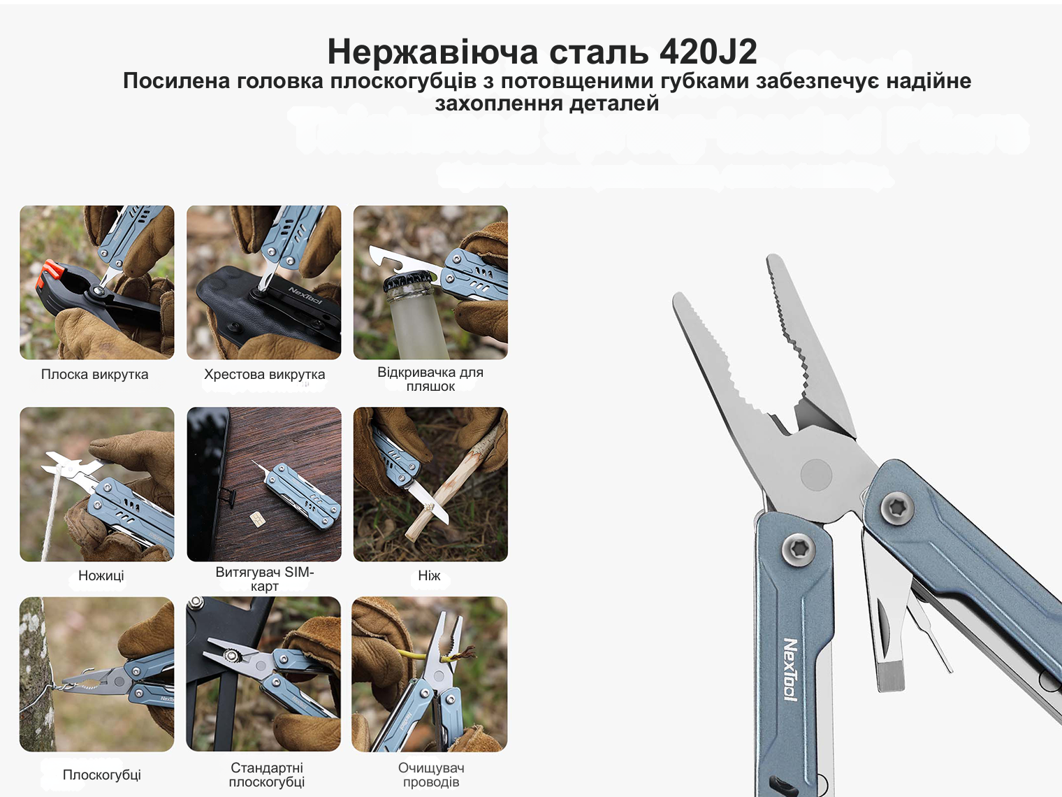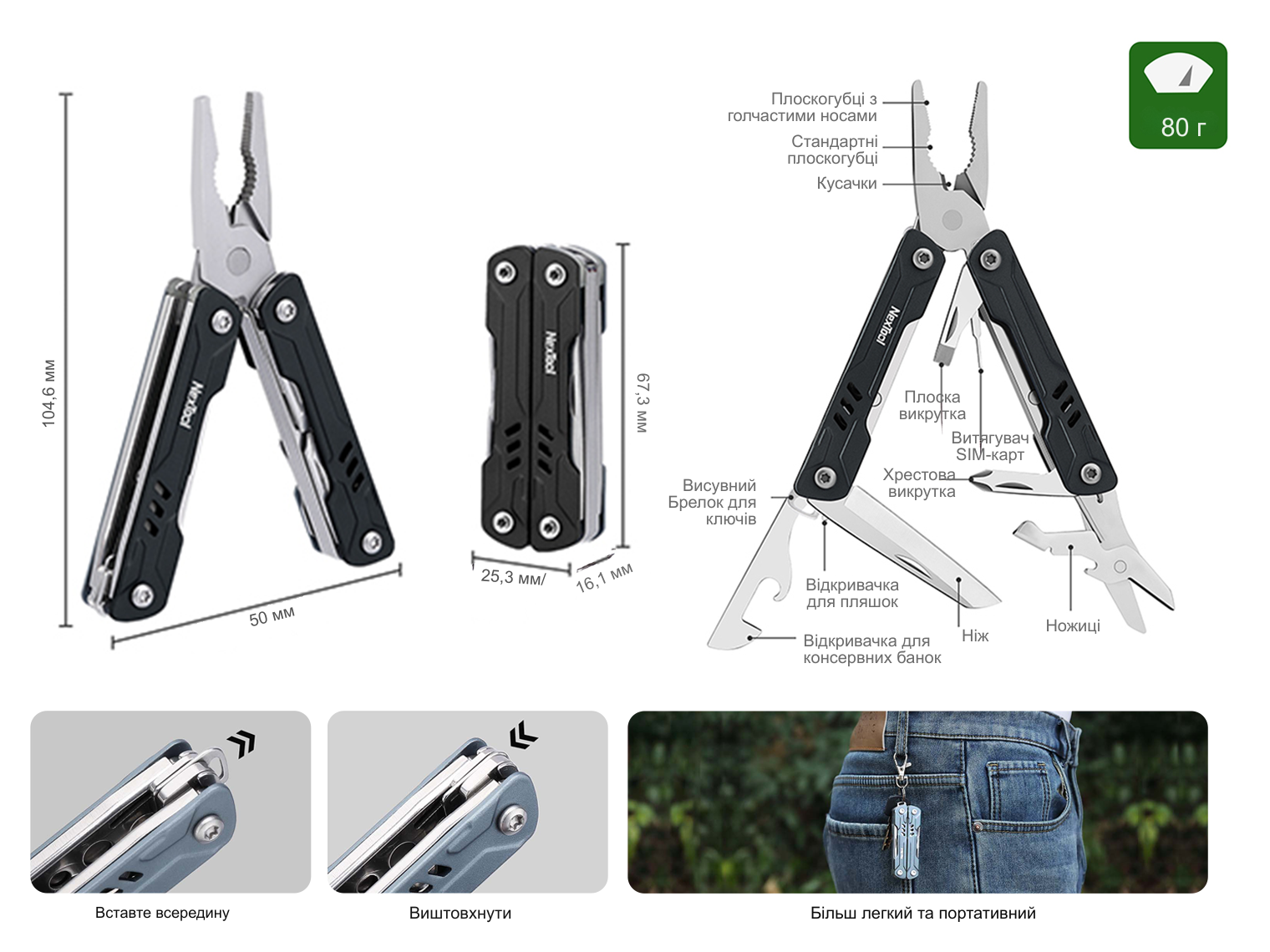- 11 функцій. Класичні плоскогубці, гострогубці, кусачки, ножиці, ніж, хрестова викрутка Phillips, шліцева викрутка, відкривачки для пляшок та консервних банок, голка для SIM-картки.