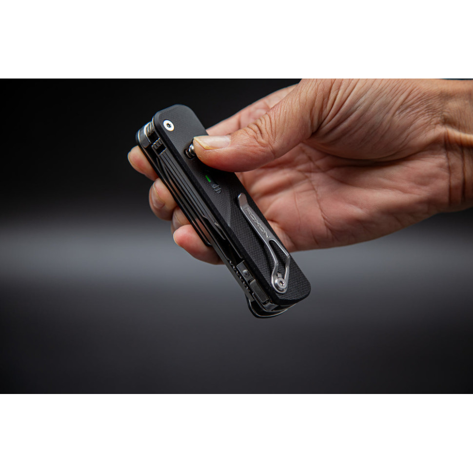 Робочі елементи плавно розкриваються та жорстко фіксуються завдяки замку Safety lock. У мультитулі передбачені двоколірні індикатори блокування. За необхідності ви можете самостійно налаштовувати роботу механіки: ступінь затягування інструментів та леза регулюється за допомогою ключа T8 з комплекту. На руківʼї є знімна кліпса для кріплення мультитула на ремені або кишені.