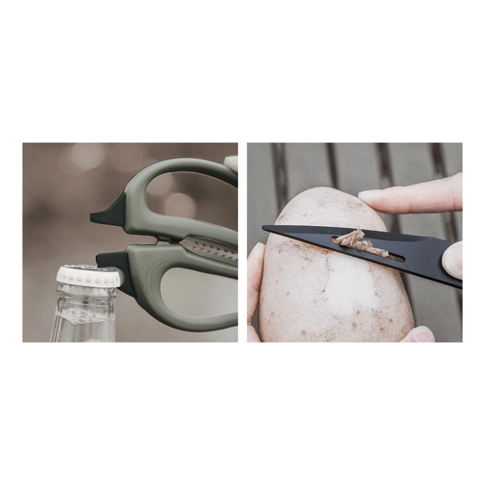 - Ножиці зі сталі 3Cr13 з поліпропіленовим руківʼям (PP). Ножиці мають швидкознімний механізм і відрізняються універсальністю: вони підходять і для обробки продуктів, і для розкриття паковань.