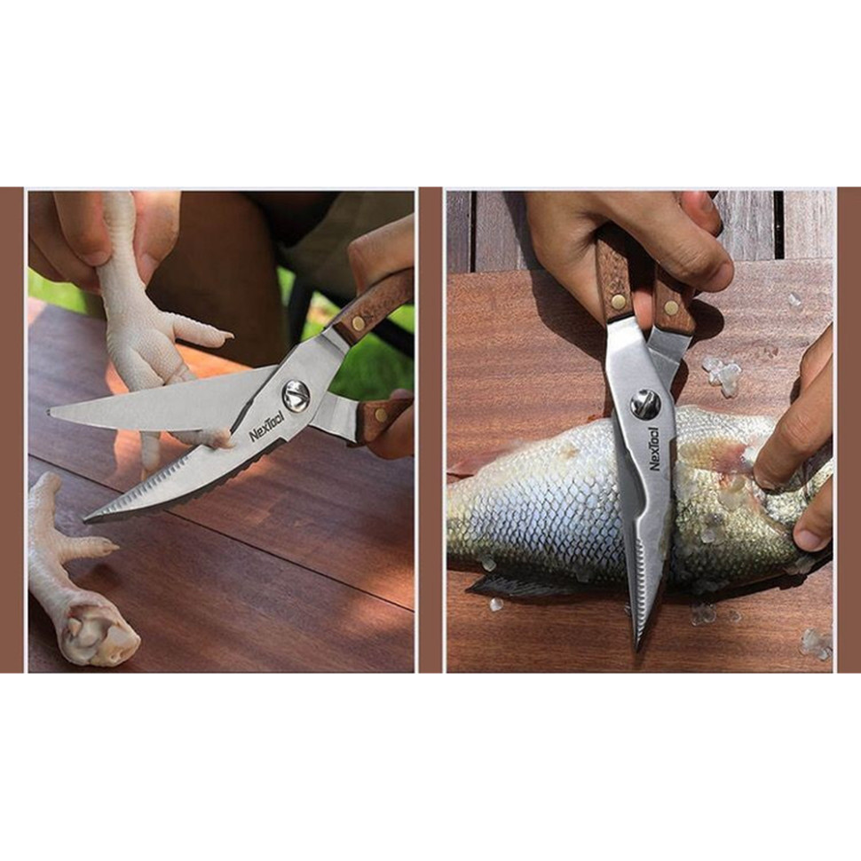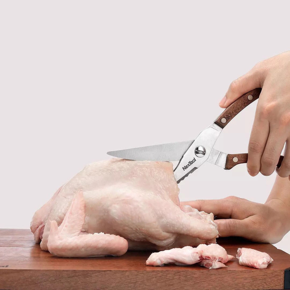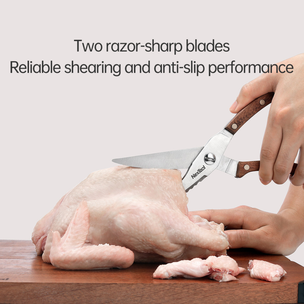- Ножиці з подвійним лезом. Гострі дрібнозубчасті леза з міцної сталі 30Cr14 рівномірно розподіляють зусилля під час різання та запобігають зісковзуванню. Ножиці легко справляються навіть зі щільними продуктами, такими як м'ясо та хрящі.