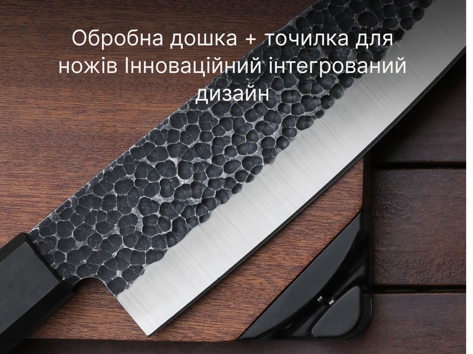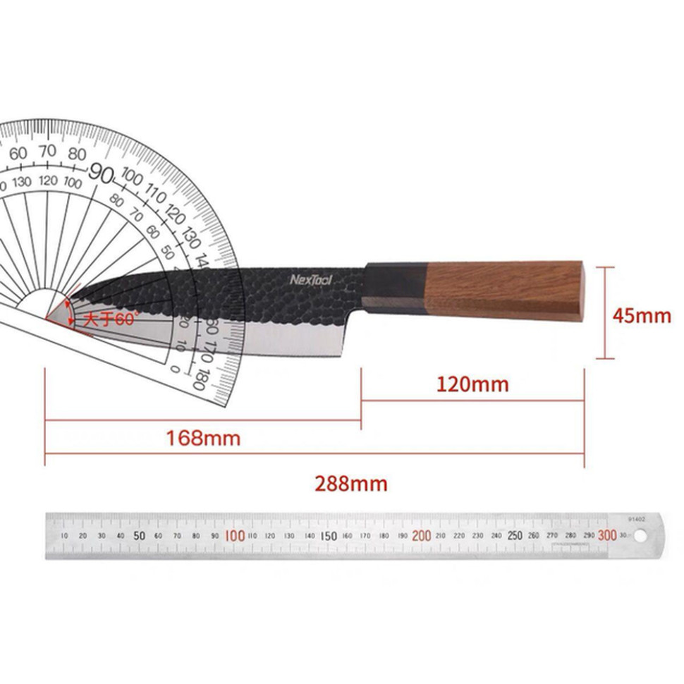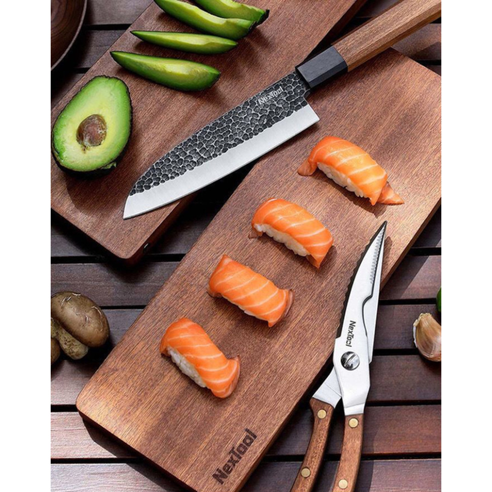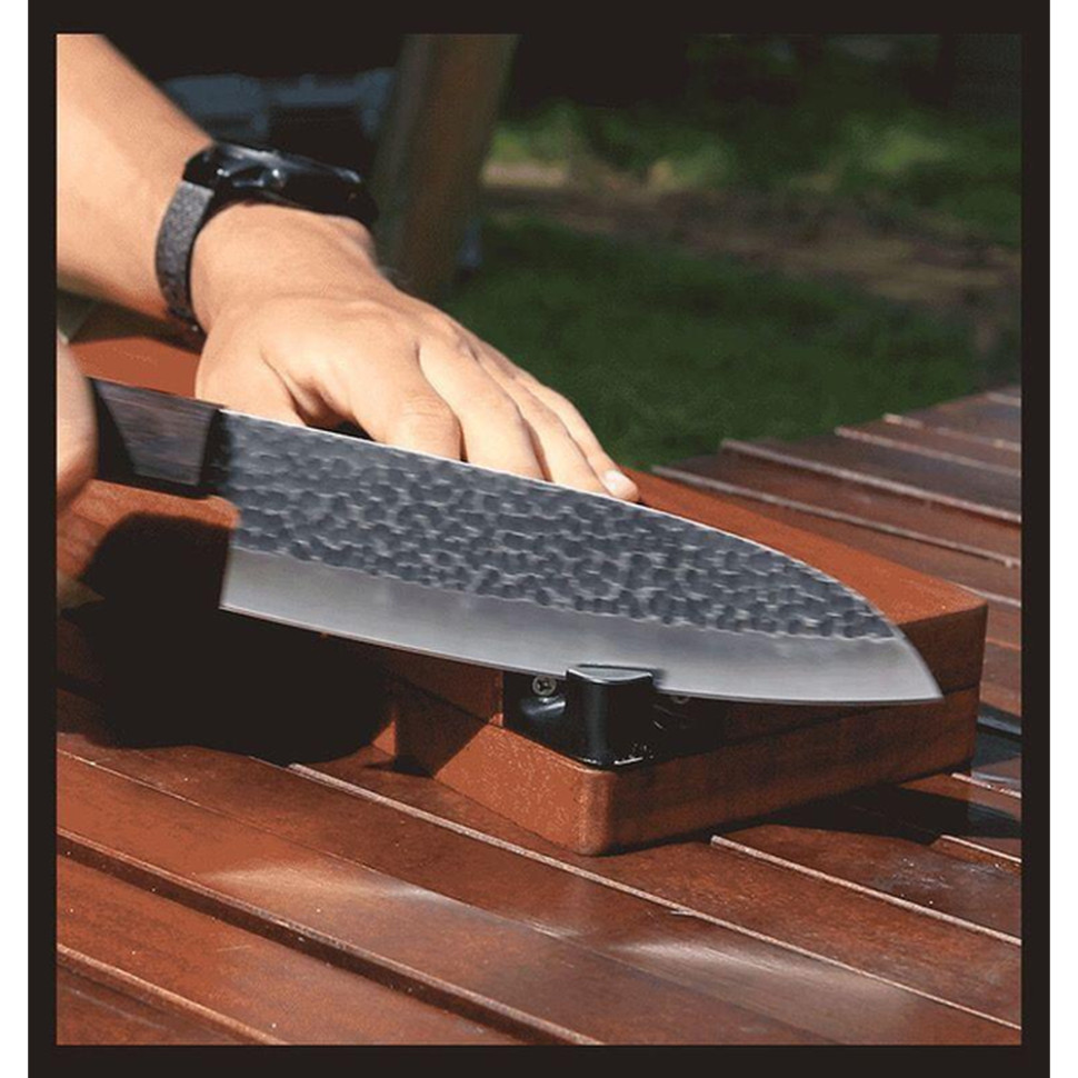 - Ніж Santoku. Класичний ніж для обробки м'яса, риби, овочів та фруктів. Лезо ідеальне як для нарізання тонкими слайсами, так і для оброблення. Клинок виготовлений з нержавіючої сталі 30Cr13, що пройшла вакуумну обробку PVD з титановим покриттям. Це не тільки додає ножу міцності та стійкості до корозії, але й робить його поверхню менш схильною до налипання їжі.