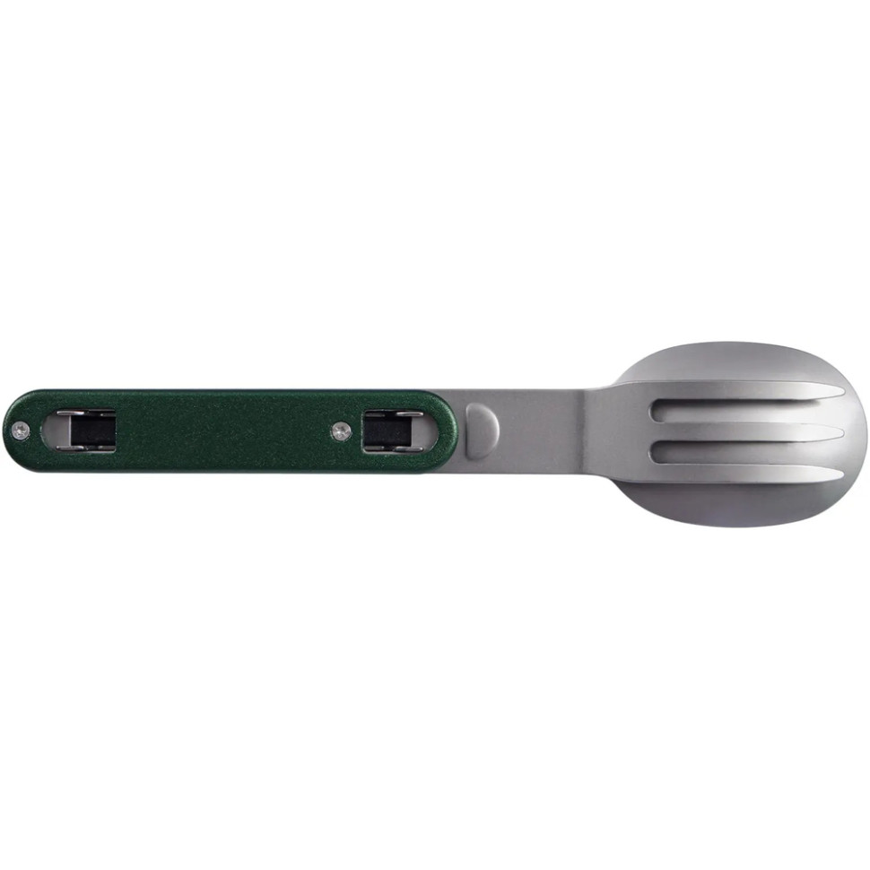 Набір складається з ложки, виделки і ножа, виготовлених зі сталі, руків’я ножа виконане з алюмінію. Всі прибори надійно з’єднуються одне з одним, щоб займати менше місця і мати змогу компактно зберігати його в похідному рюкзаку.