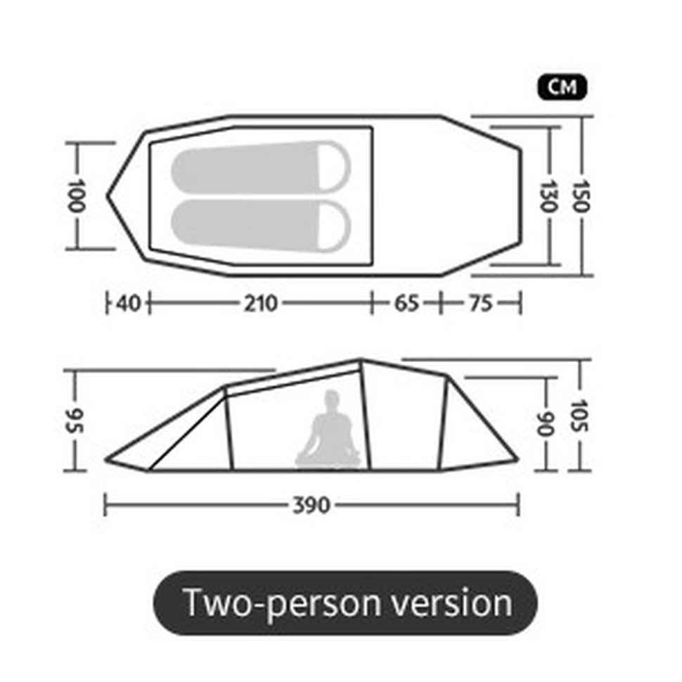 Загальні габарити намету після встановлення сягають 390 х 150 х 105 см. Розміри зони для сну — 210 х 100 см, що ідеально для двох осіб. Попереду є просторий тамбур для зберігання рюкзаків, взуття та обладнання, щоб звільнити житловий простір.