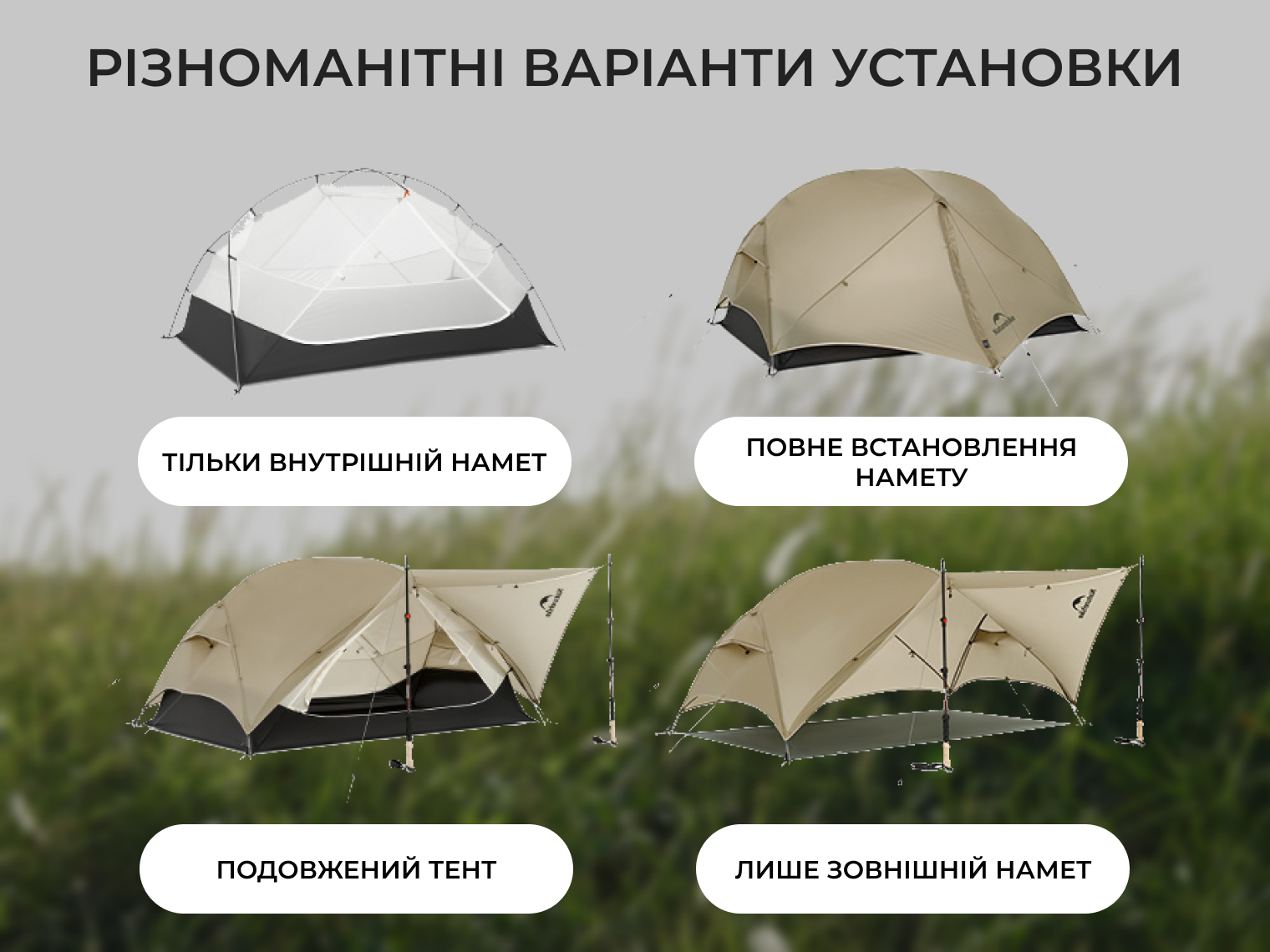 Намет Naturehike CNK2550WS016 — це універсальна модель для трьох сезонів. Полегшена двошарова конструкція ідеальна для тривалих піших мандрівок. Вона важить лише 1,53 кг попри місткі розміри після встановлення (220 х 240 х 110 см), чого достатньо для відпочинку кількох осіб.