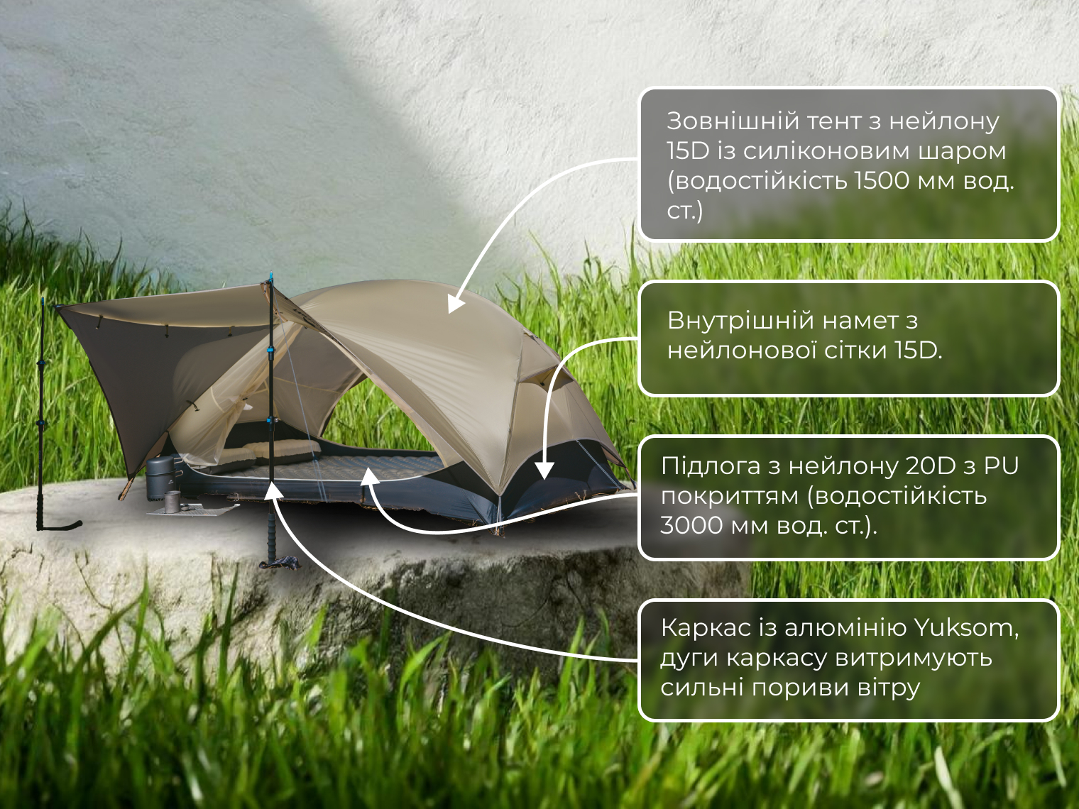 - Зовнішній тент з нейлону 15D із силіконовим шаром. Матеріал відрізняється легкістю та стійкістю до механічних пошкоджень. Силікон надає додаткову водостійкість (1500 мм вод. ст.), протистоїть намоканню під час короткочасних опадів, роси та туману.